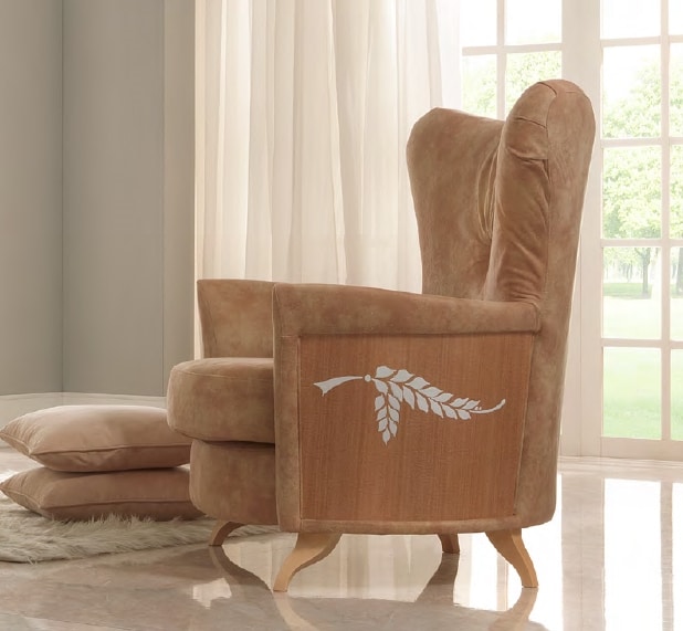 Poltrona piedini e fianchi in legno noce, con decori floreali argento.