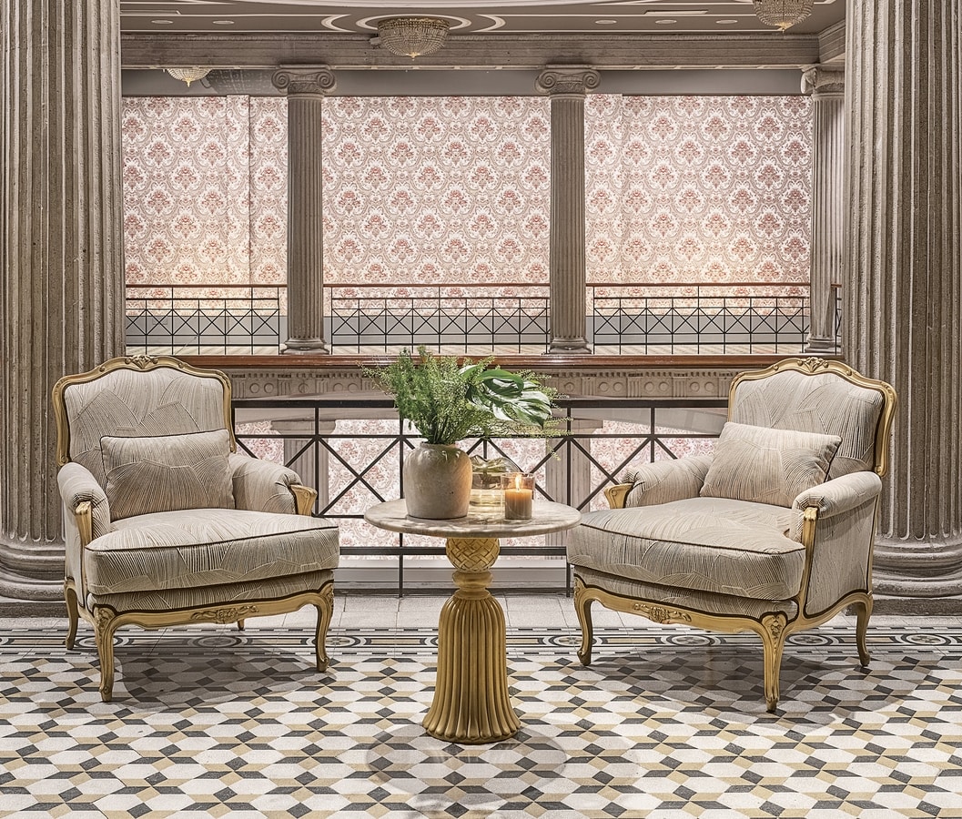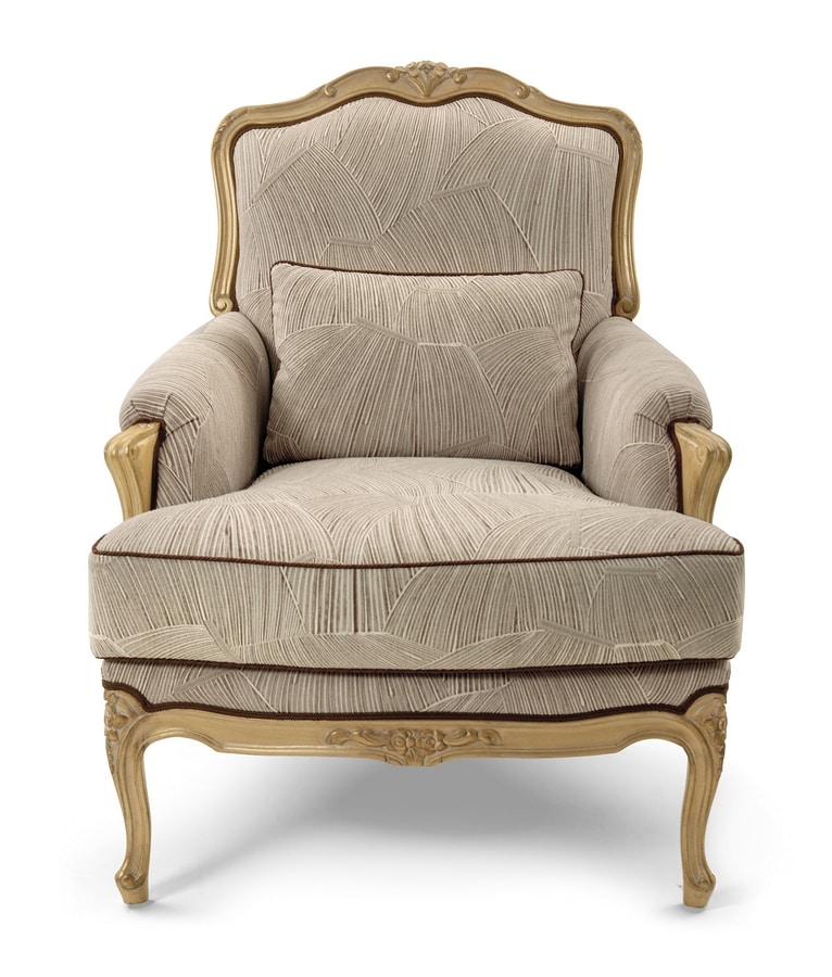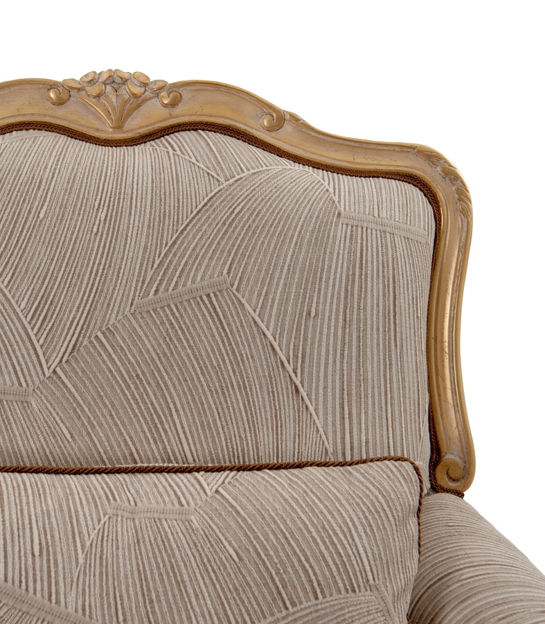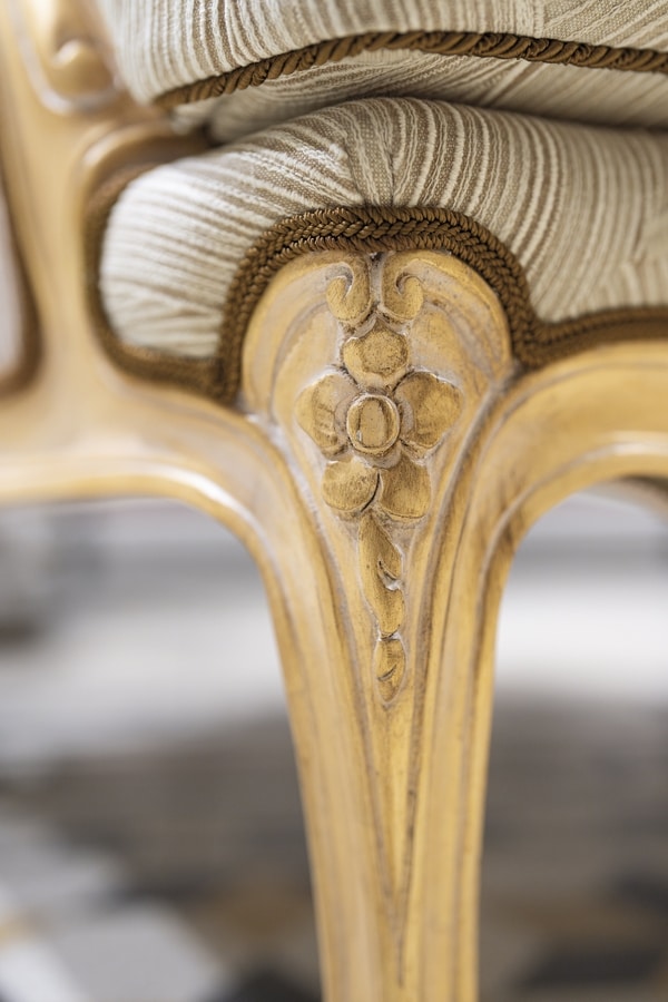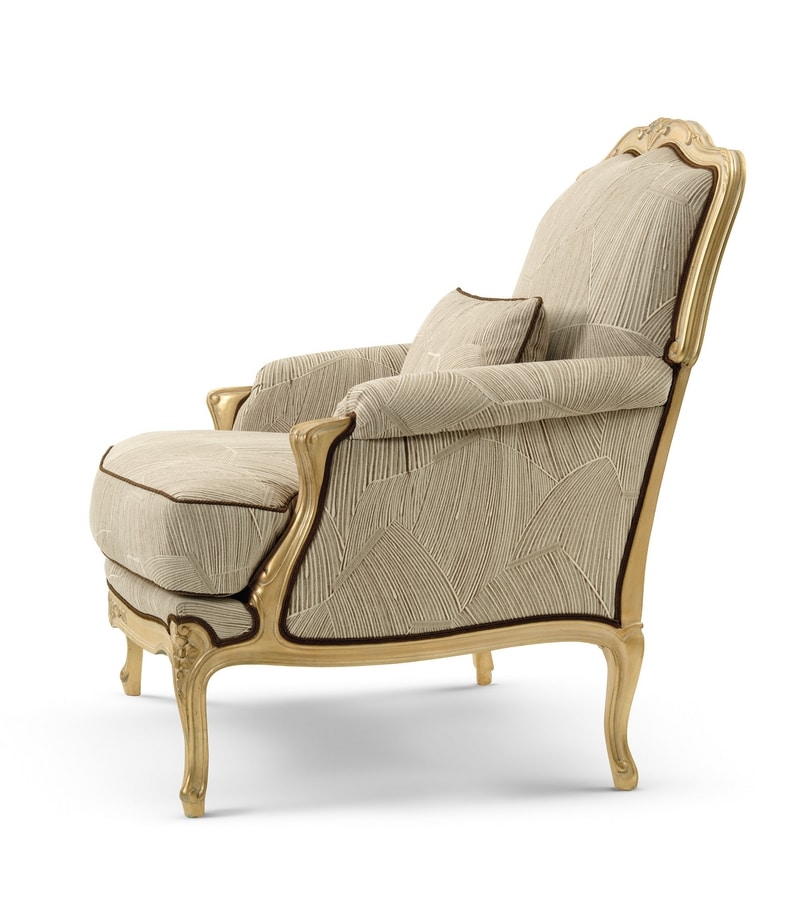 Linee armoniose e dettagli scolpiti definiscono questa elegante poltrona in legno, impreziosita da una finitura OCH in foglia oro patinato bianco meringa. L’imbottitura generosa e il rivestimento in tessuto decorativo con profili in contrasto ne esaltano il carattere classico e raffinato.