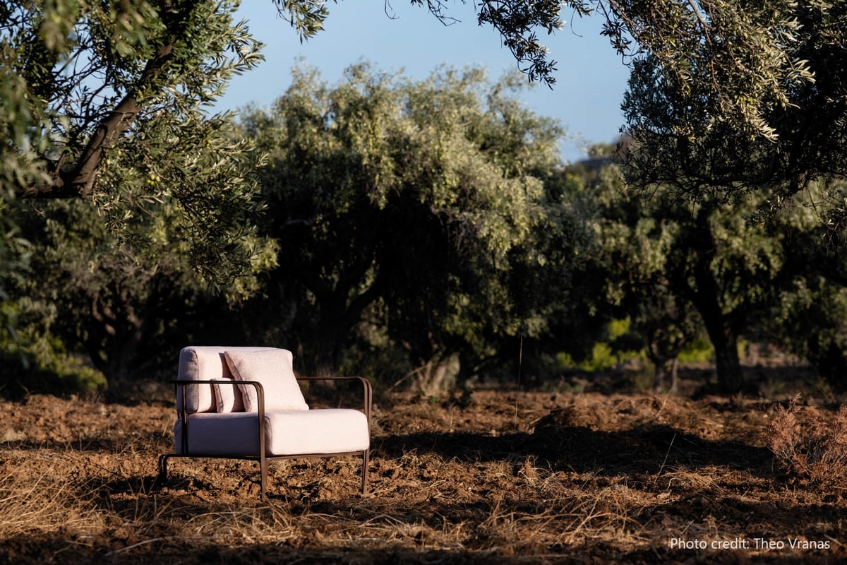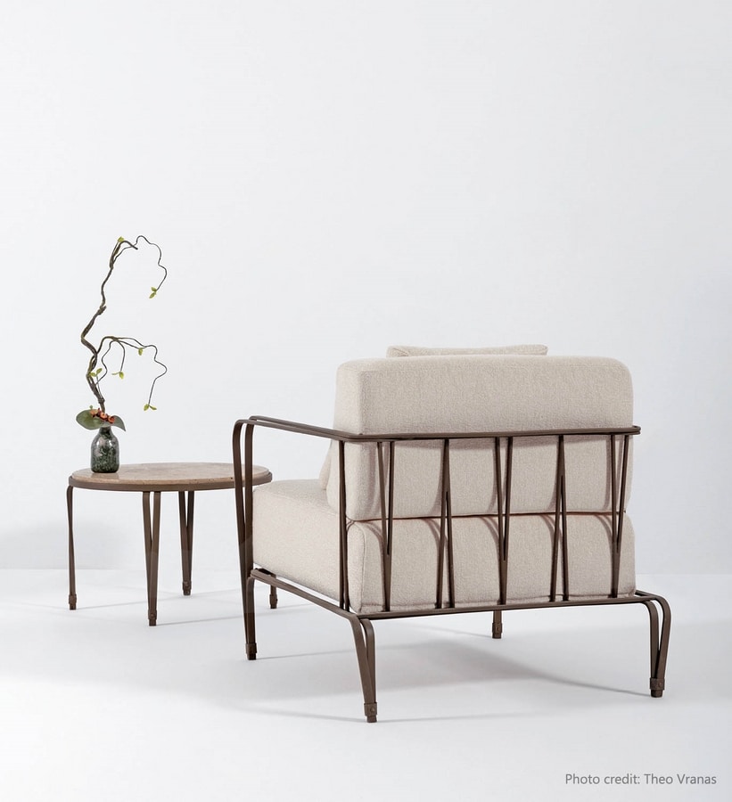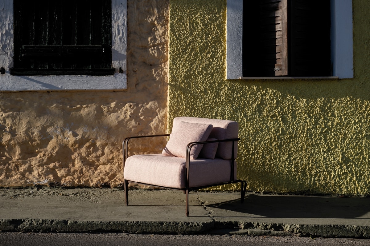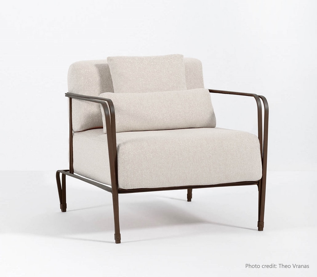 Poltrona in acciaio inox AISI 304, dalle linee semplici e senza tempo adatta ad arredare diversi tipi di spazi, disponibile anche con finiture da interno, nella versione da esterno zincato e verniciato a polvere, cuscinerie in tessuto Sunbrella incluse.