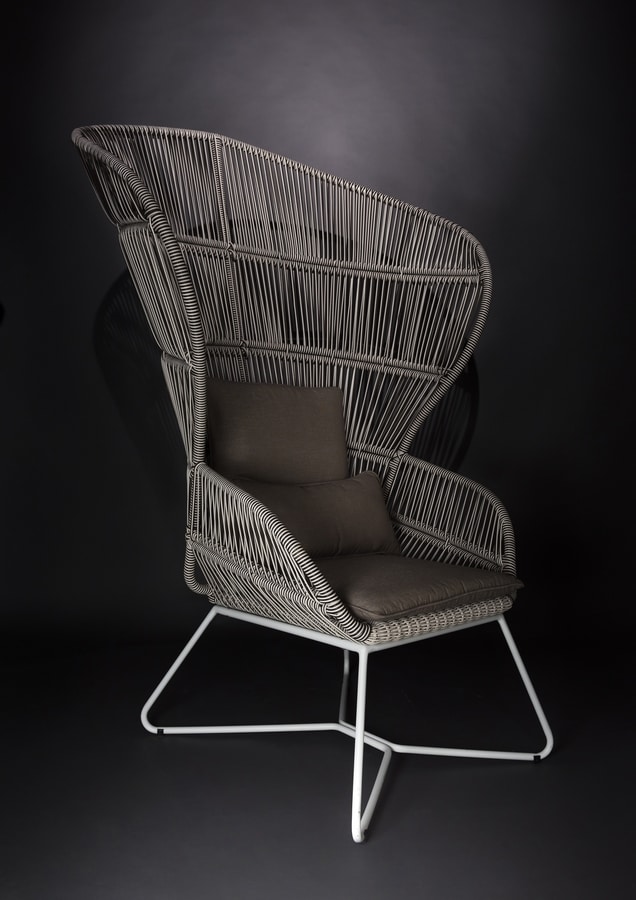 Poltrona in rattan sintetico, base in metallo, con cuscini sfoderabili.