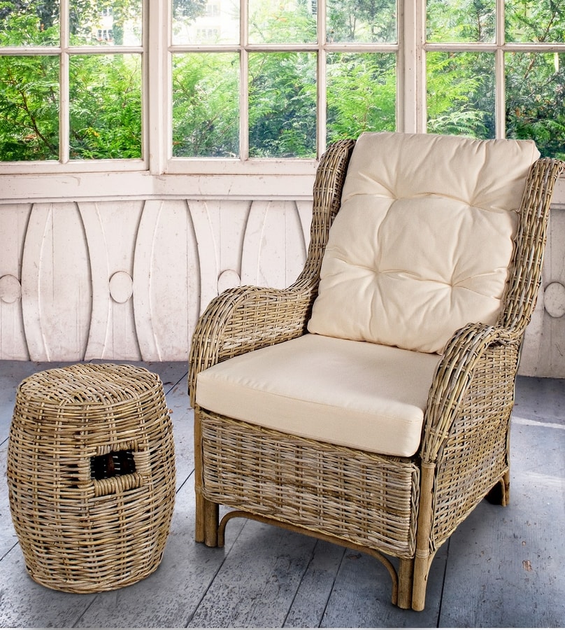 Poltrona relax con struttura in rattan (giunco) ed intreccio in kubu. Cuscino seduta sfoderabile, cuscino schienale con trapuntatura, entrambi in poliestere. Adatta sia ad uso interno che ad uso esterno.