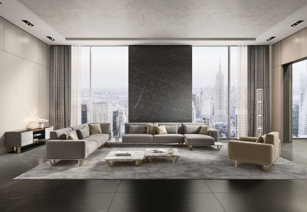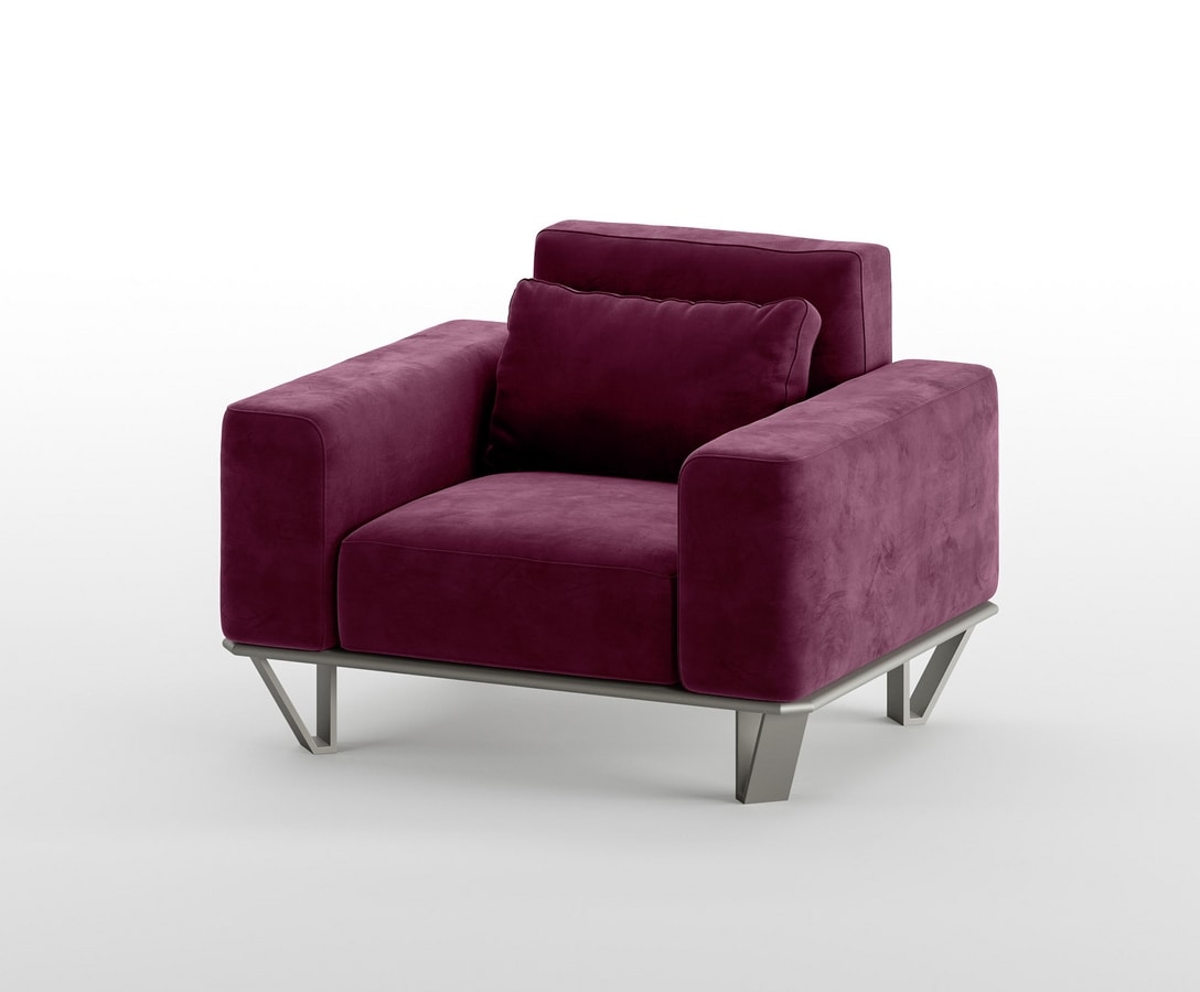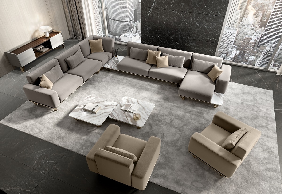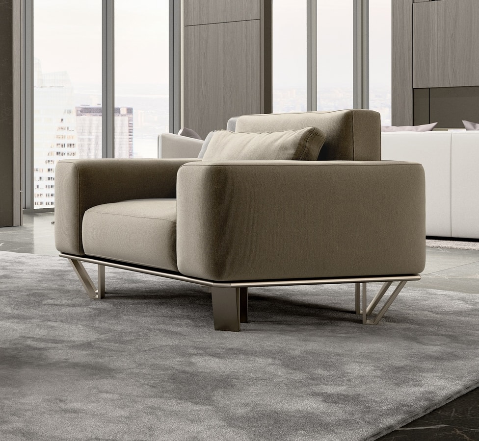La poltrona Futura ha forme morbide e generose. Una linea di base in metallo unisce le parti imbottite con i piani marmo sagomati, i piedi geometrici in metallo contrastano con le linee diagonali e rendono leggera l'immagine delle composizioni.