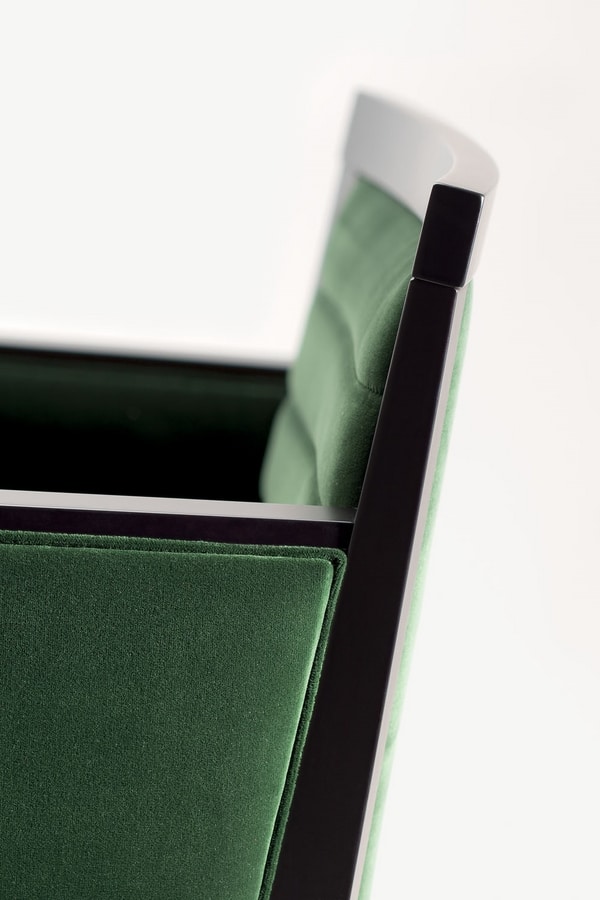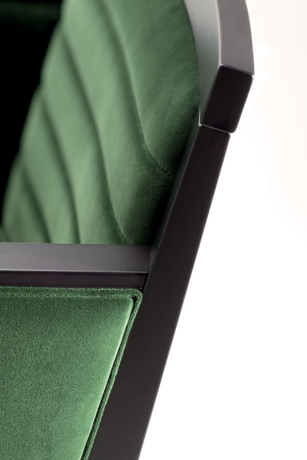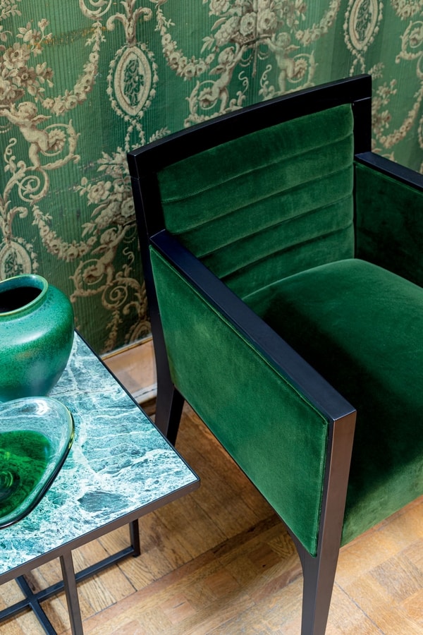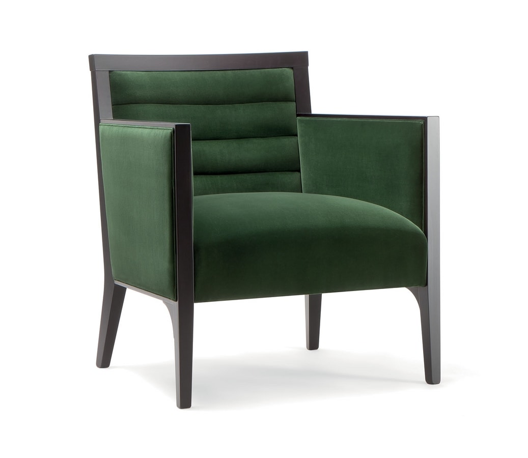 Memorie del '900 e rigore formale contemporaneo, convivono piacevolmente in un'ideale armonia fra il legno, il tessuto e il metallo. La poltrona Ginevra rappresenta un'ottima soluzione per arredare con eleganza ristoranti e hotel. La cornice in legno massello, così come le gambe, racchiudono un sedile e uno schienale sapientemente imbottiti. Le diverse tinte del legno, abbinabili a raffinati tessuti, offrono la possibilità di personalizzare i prodotti e creare match perfetti per ogni spazio.