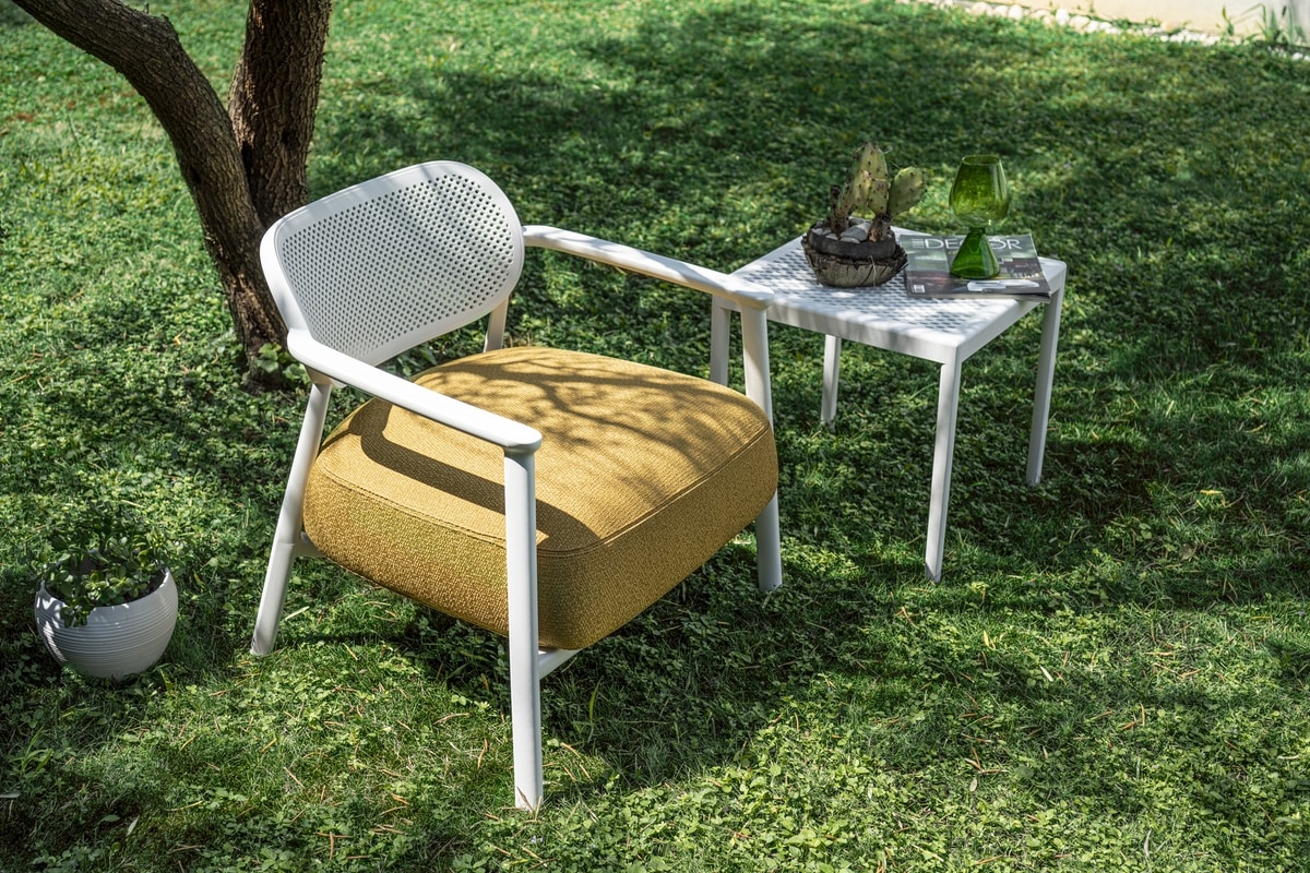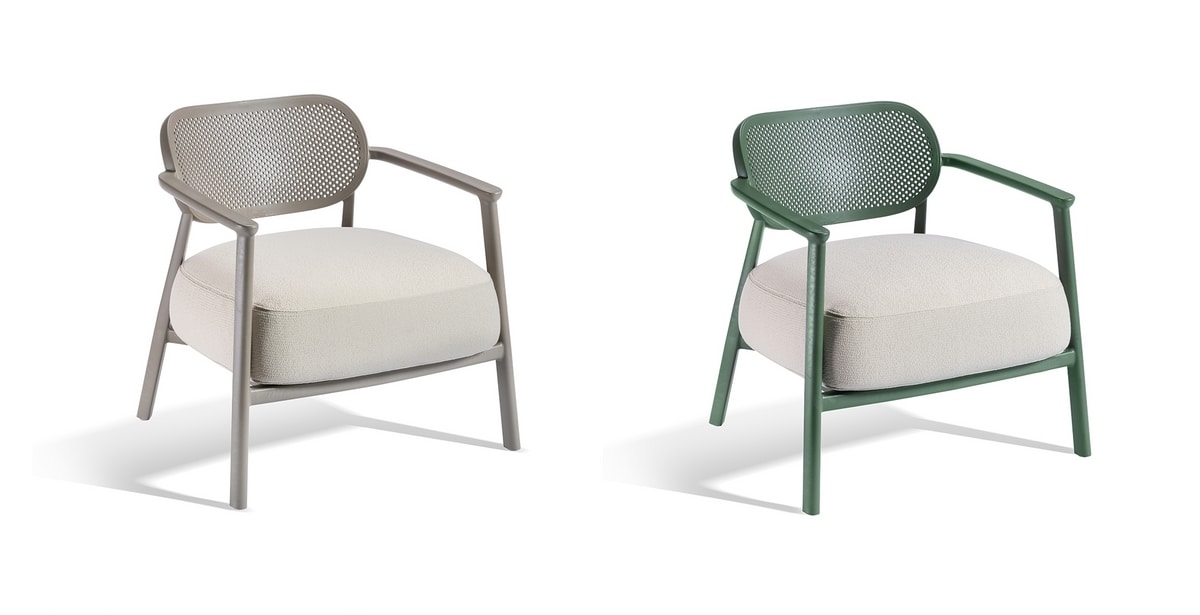 La poltrona Nuta Lounge, con la sua struttura traforata in tecnopolimero e le sue forme armoniose, completa la collezione Nuta aggiungendo ancora più comfort grazie alla sua ampia seduta. Perfetta come lounge o seduta d'attesa, si distingue per la sua estetica unica e il design ricercato. Il cuscino, profondo ed estremamente confortevole, è disponibile in diverse tipologie di rivestimento, garantendo un'esperienza di relax senza pari, sia per spazi indoor che outdoor. I tappi in gomma termoplastica ad alta resistenza permettono di spostarlo senza lasciare segni o fare rumore, per il massimo della funzionalità e praticità.