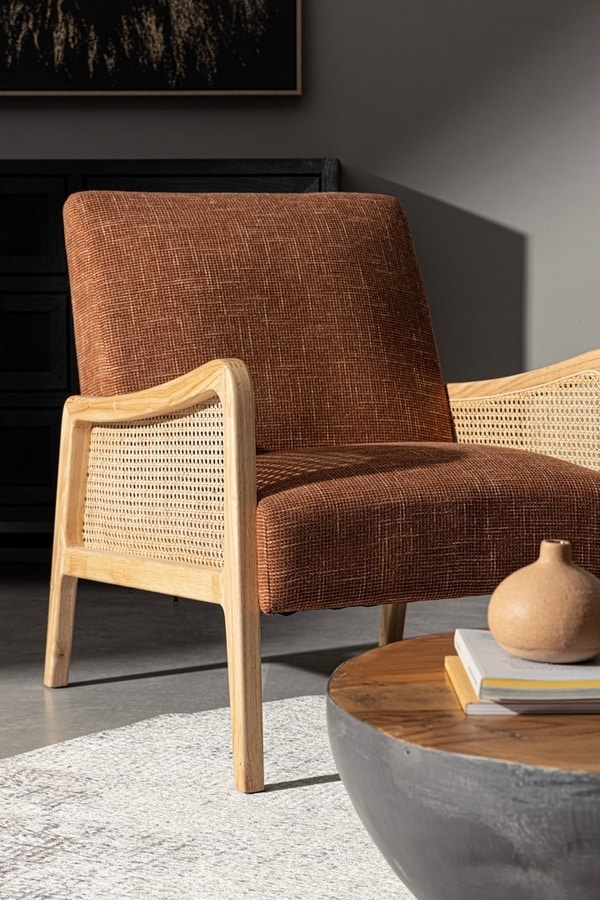 Poltrona con struttura in legno di pino e compensato. Gambe in rubberwood. Braccioli con inserti in rattan. Rivestimento in poliestere. Densità imbottitura in schiuma poliuretanica 24 kg/m3.