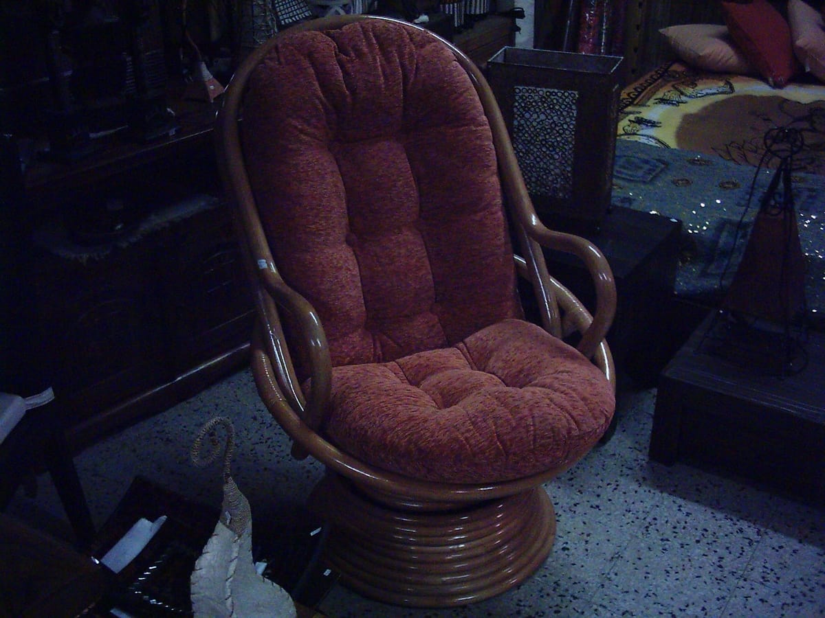 Poltrona girevole in rattan con piani a sfere e molle per dondolare.