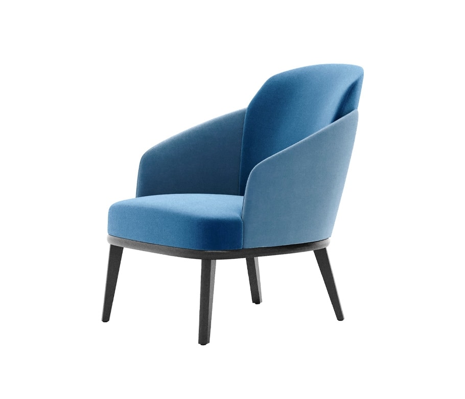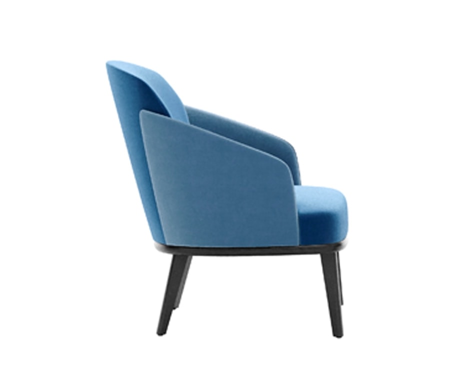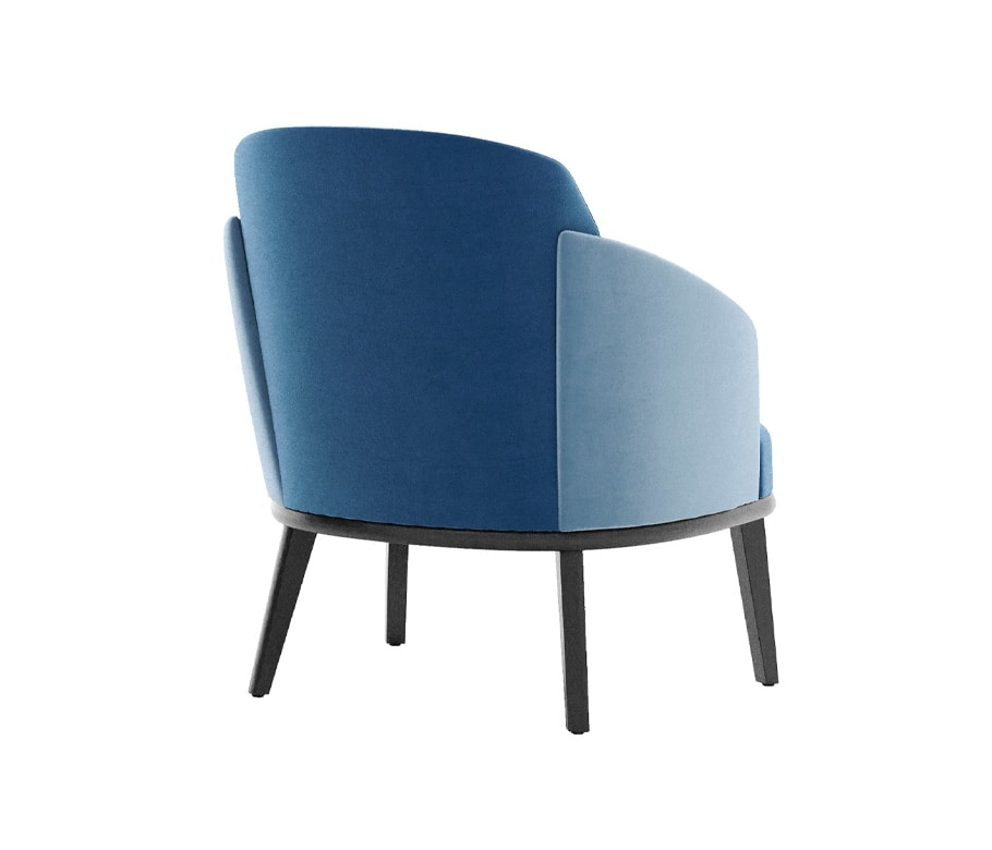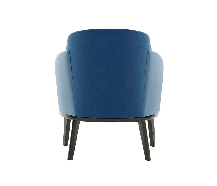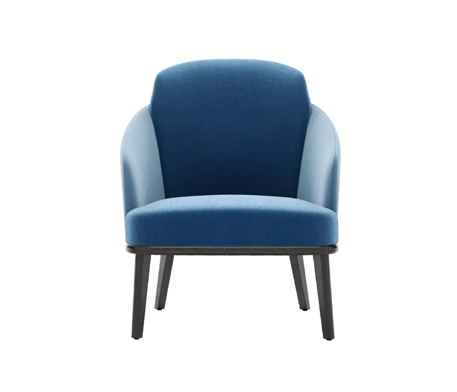Poltrona Lounge, telaio sedile con bordi arrotondati e gambe triangolari in legno massello. Scocca con alette in schiumato. Sedile cinghiato. Tappezzato su fusto.