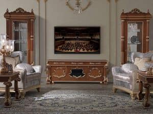 Mobile porta tv, in stile classico di lusso, con intagli e intarsi artigianali