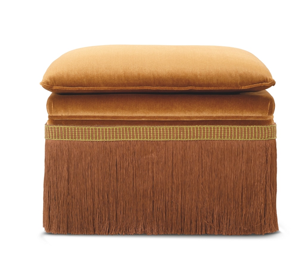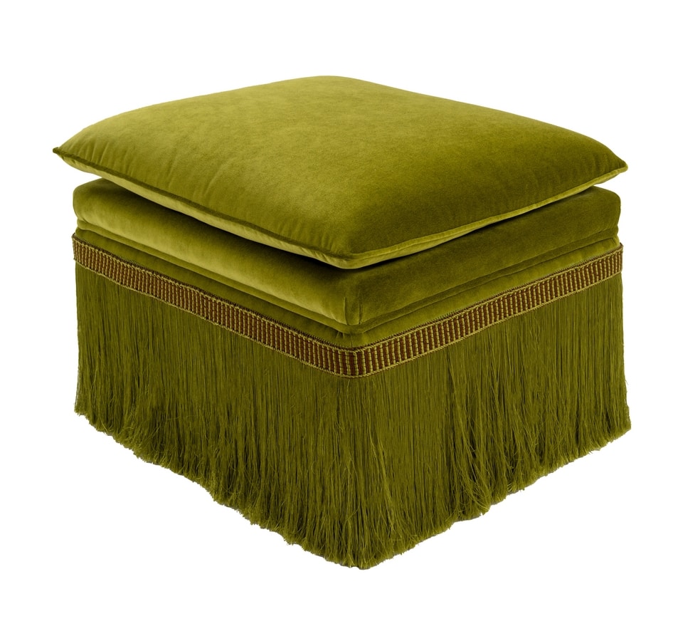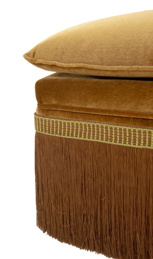 Pouf imbottito e rivestito in velluto, completo di cuscino superiore coordinato. La base è impreziosita da una lunga frangia decorativa.