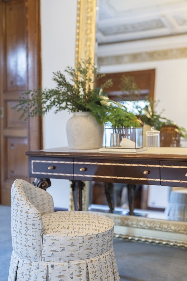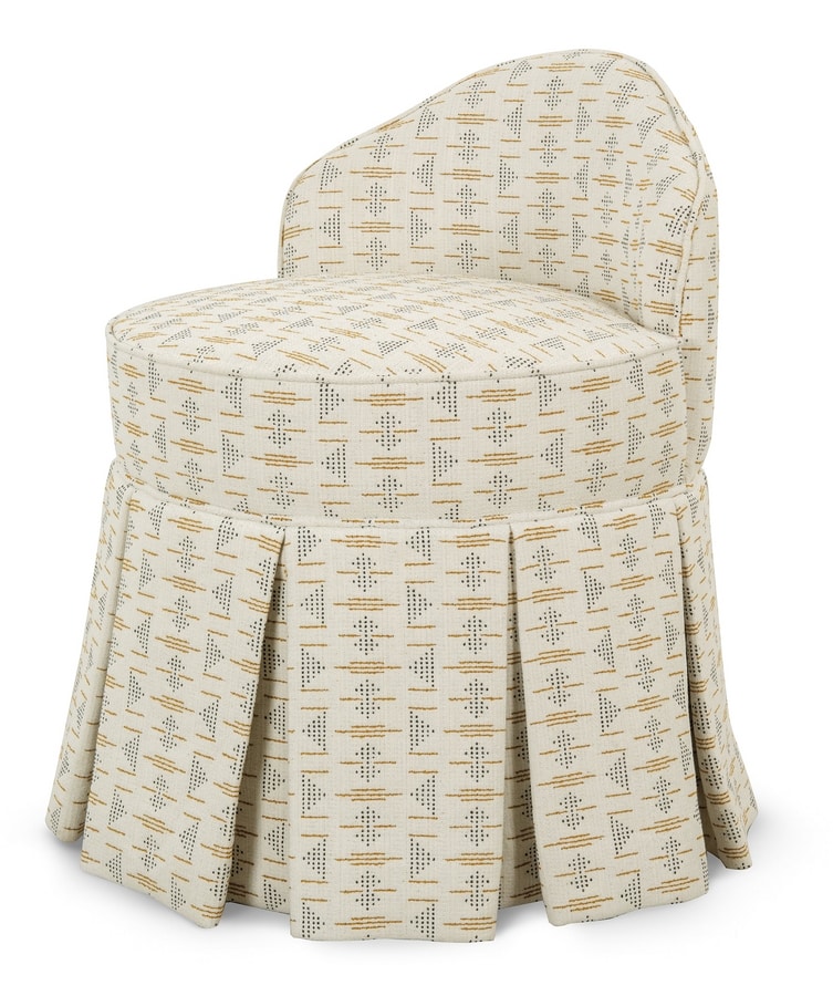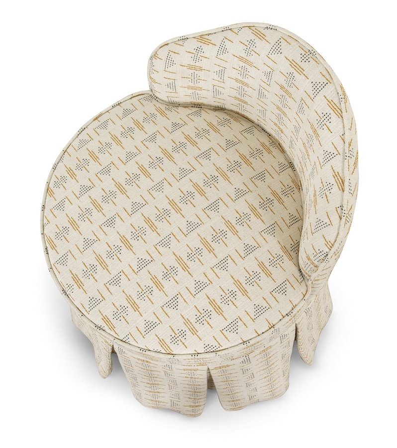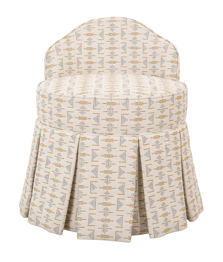 Pouf con schienale arrotondato, interamente rivestito in tessuto decorativo. Il design elegante e compatto è valorizzato da una gonna a pieghe e da una base girevole che unisce stile e funzionalità.
