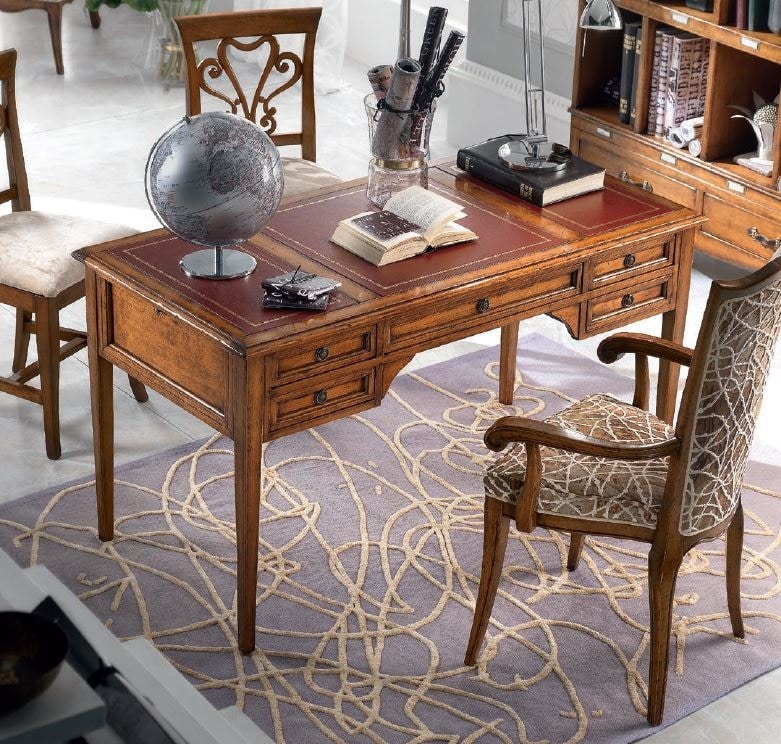 Scrivania direttorio, stile classico. Realizzata in legno e dotata di 5 cassetti. Piano con inserti in pelle.