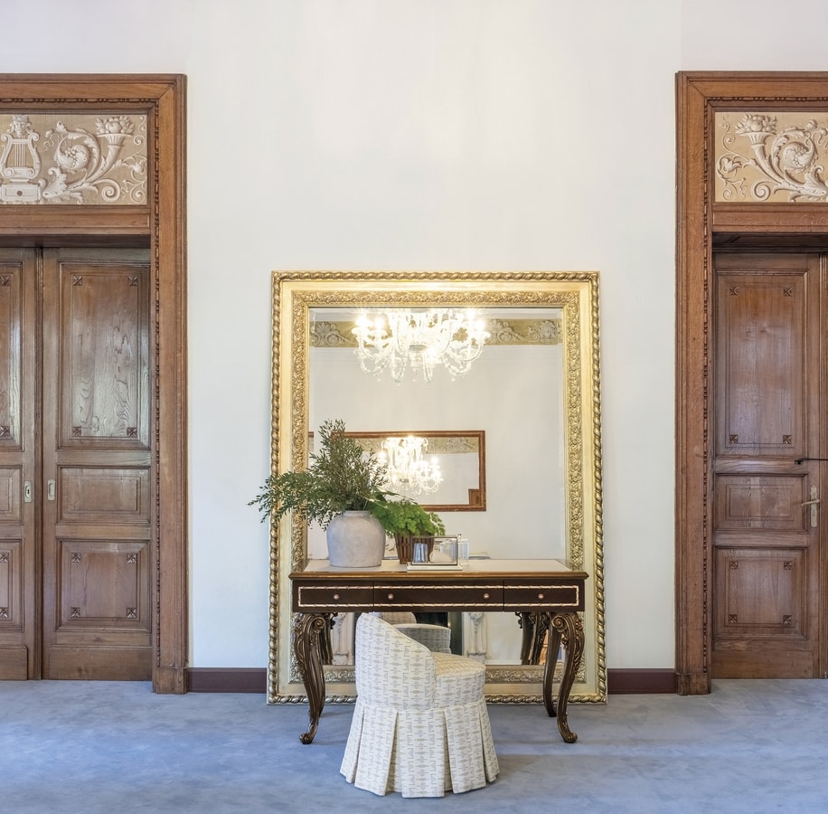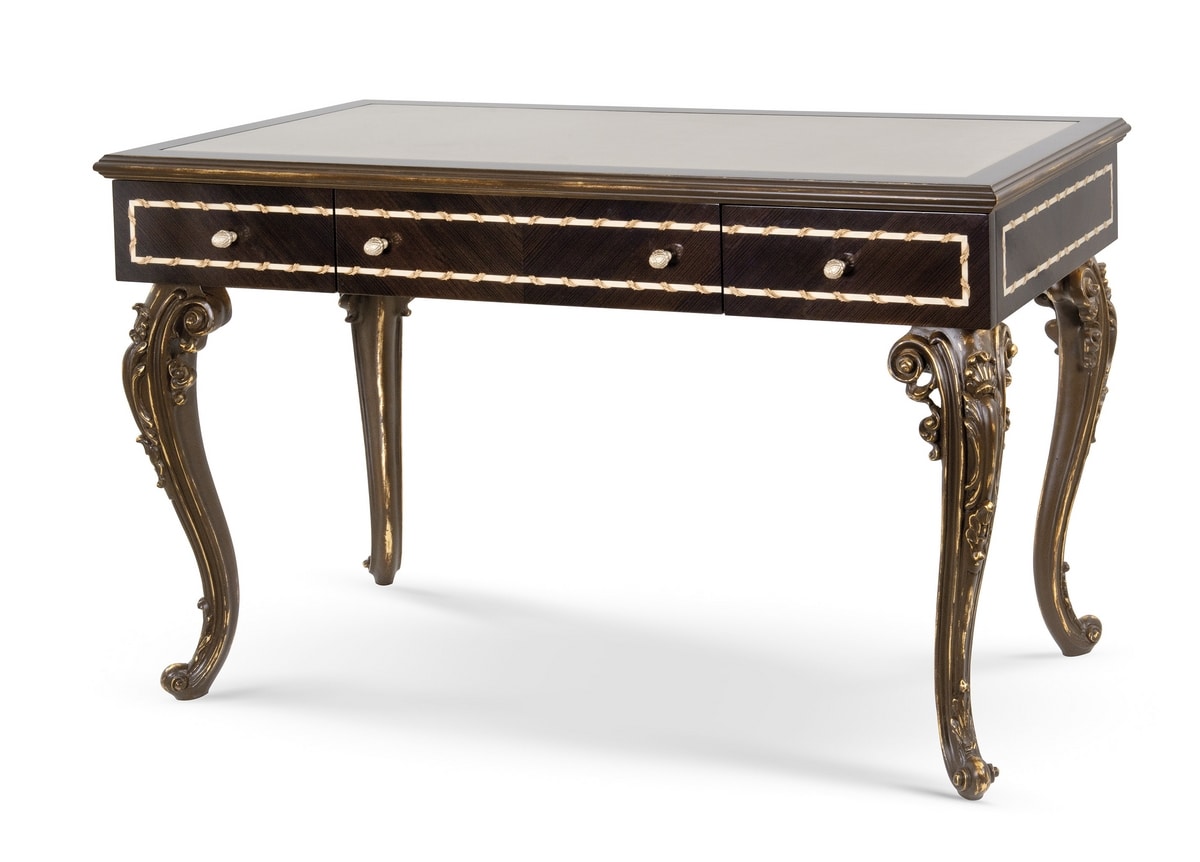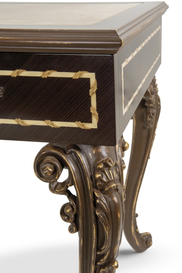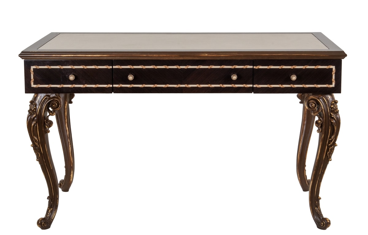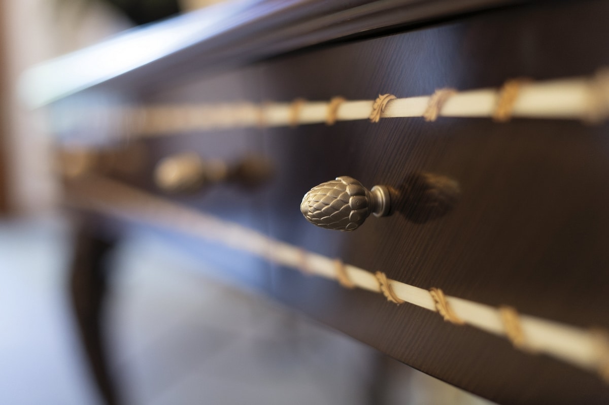 Elegante scrittoio realizzato in pino Carolina, con piano in legno arricchito da un inserto centrale in pelle. I frontali e i fianchi presentano un pregiato decoro a intarsio in acero e pero sfumato, incorniciato da una raffinata filettatura decorativa. Le gambe, finemente scolpite, esaltano la classicità dell’insieme. La finitura LAM1 – laccato spelato a tempera francese marrone con fondo in foglia oro – dona profondità e calore al pezzo.