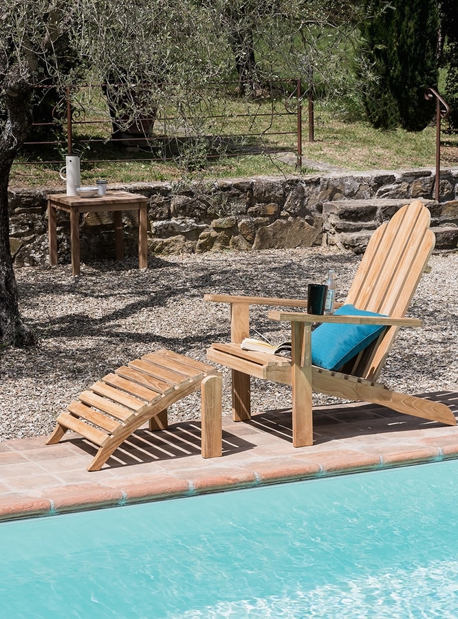 Questa sedia sdraio in legno di teak con poggiapiedi e' la riproposizione di una famosissima sedia che fu disegnata nel 1903 da Thomas Lee. La sedia Sdraio divenne un cult nella regione americana e fu conosciuta come Westport plank chair prima, e come Muskoka Chair in seguito, ed infine come adirondack.