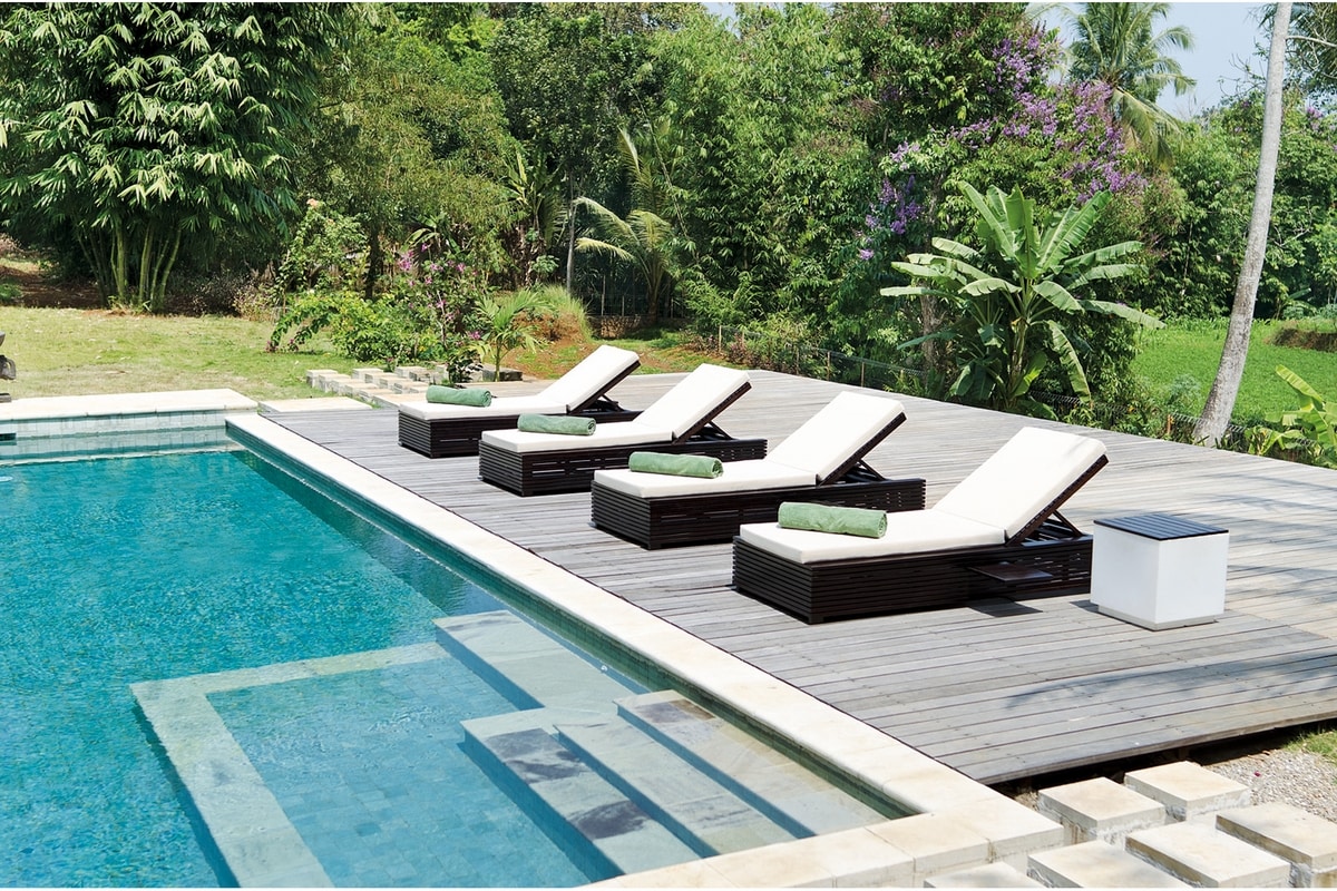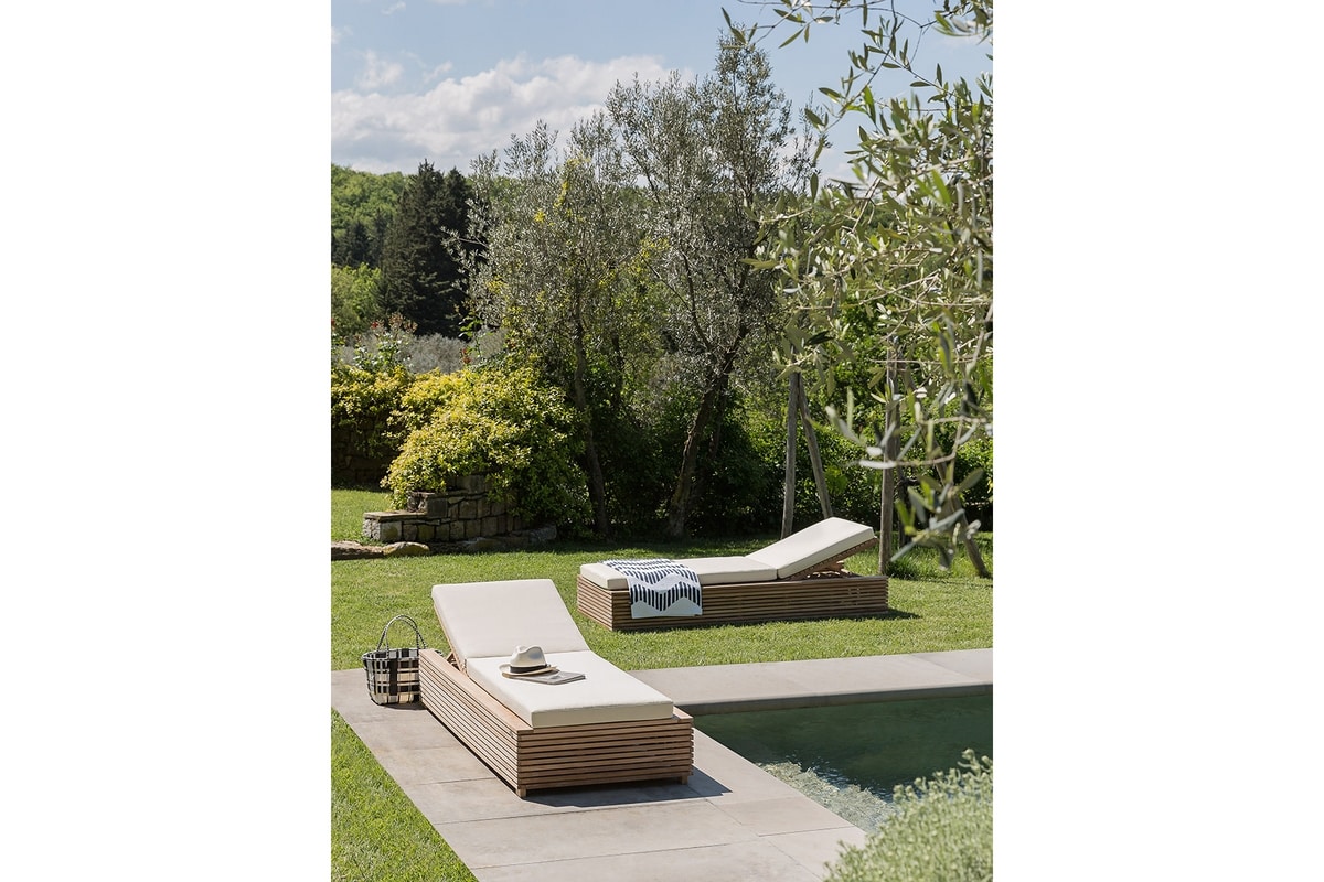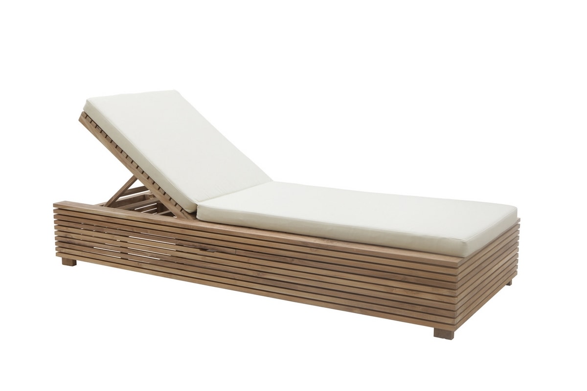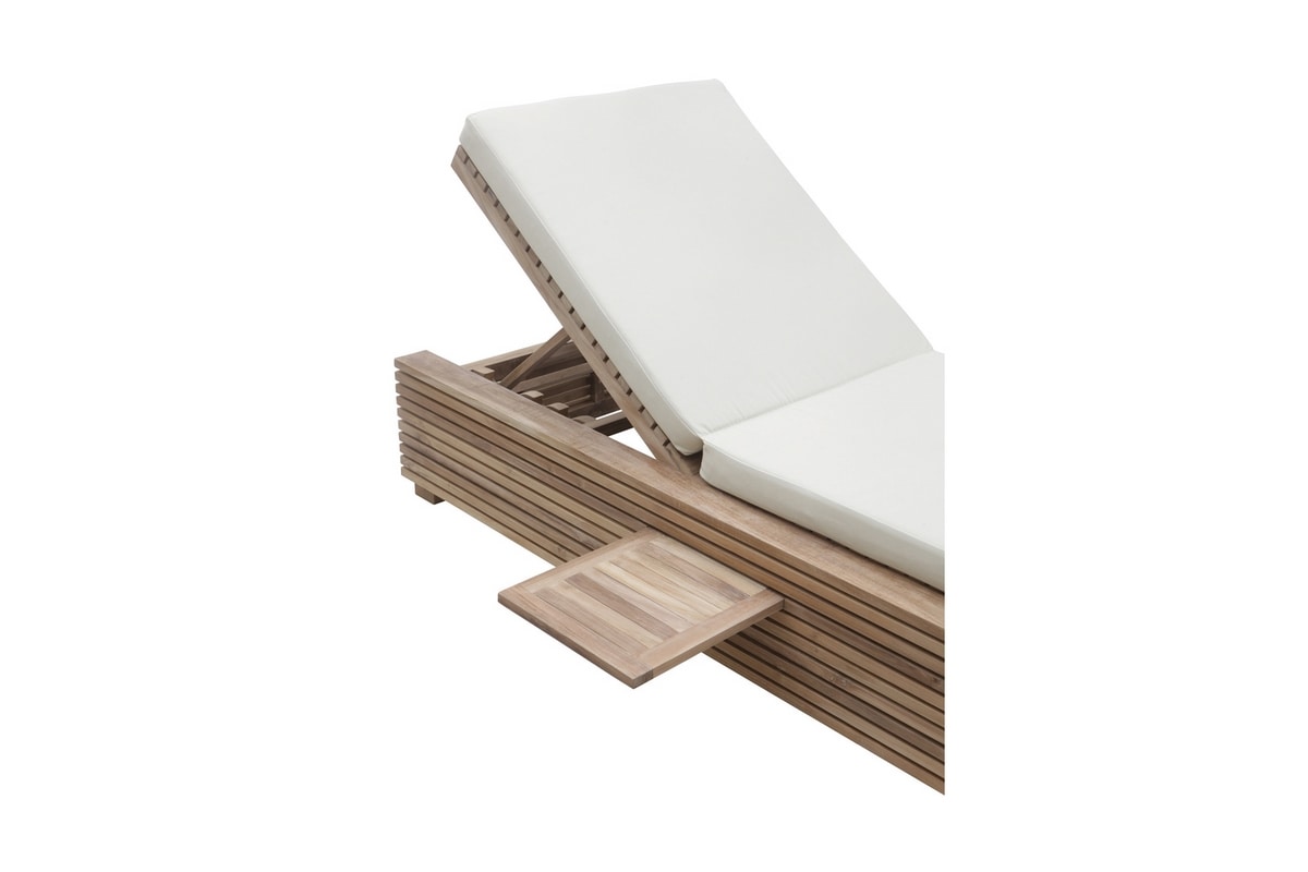 Lettino sdraio reclinabile con tavolino estraibile. Realizzato in legno di teak disponibile in diverse finiture. Materassino a richiesta. Il motivo a linee orizzontali di questo lettino sdraio contrasta e alleggerisce l’aspetto massiccio dovuto alle ampie dimensioni e all’abbondante uso di legno nelle parti laterali. Il tavolino è estraibile da ambo i lati.