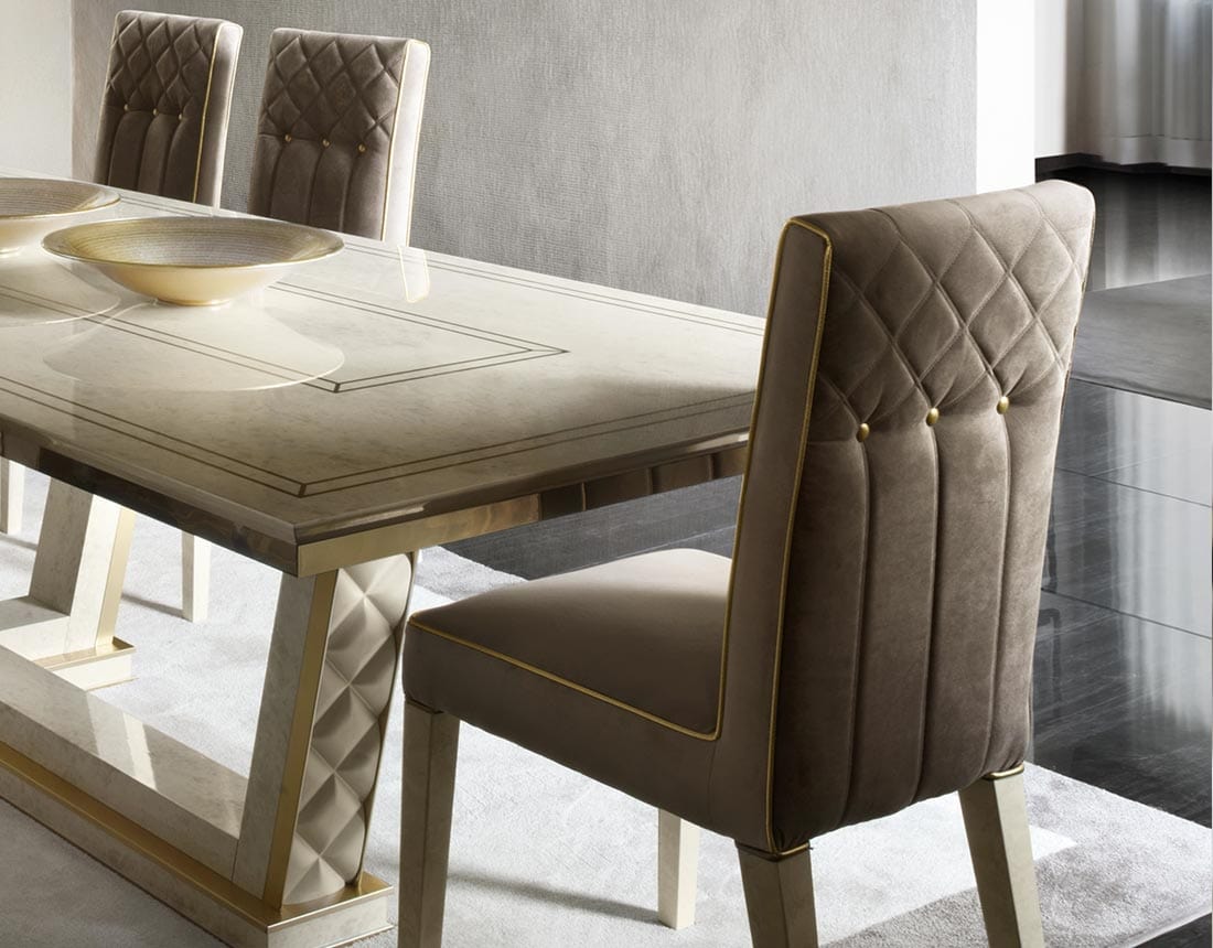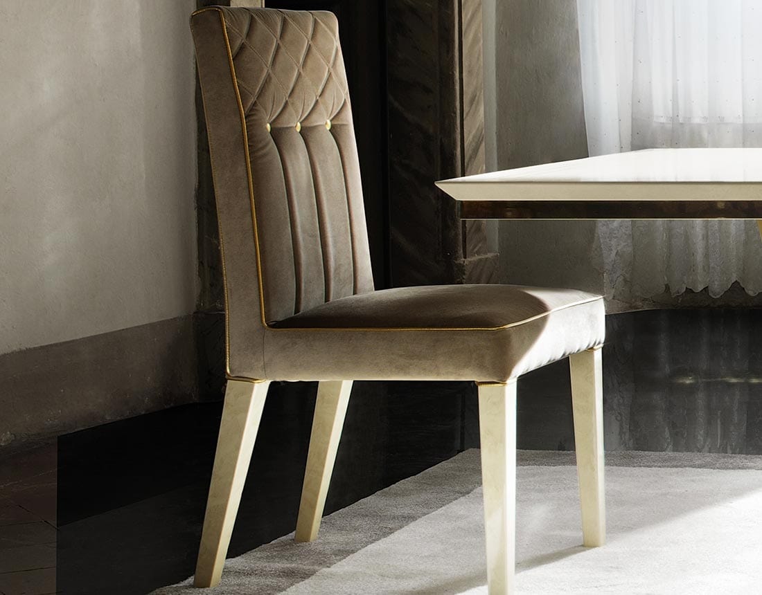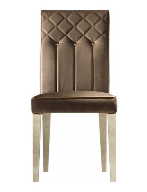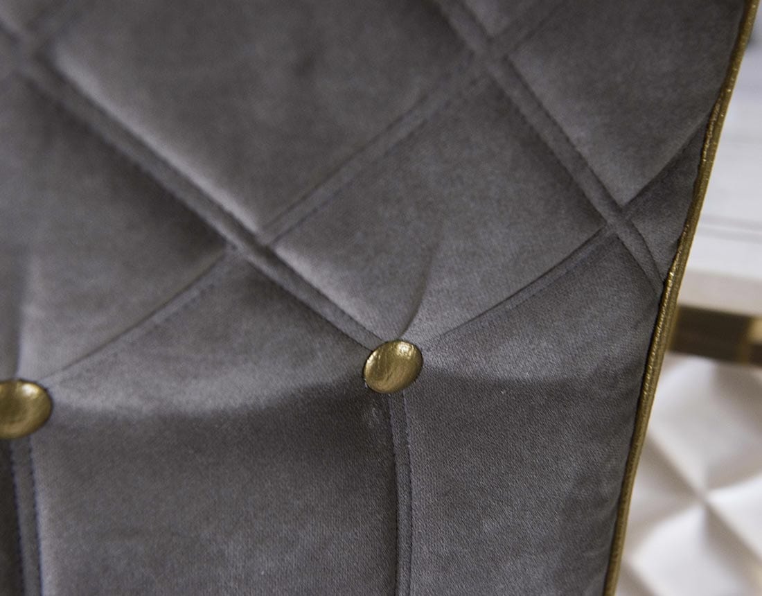 Le sedute Sipario riprendono in maniera sobria ed elegante la lavorazione capitonné che caratterizza l’impianto decorativo dell’intera collezione. Le bordature dorate ne valorizzano i profili squadrati e la forma raffinata. Piccoli tocchi di luce impreziosiscono lo schienale, movimentando la superficie del velluto con piccoli bottoni dorati.