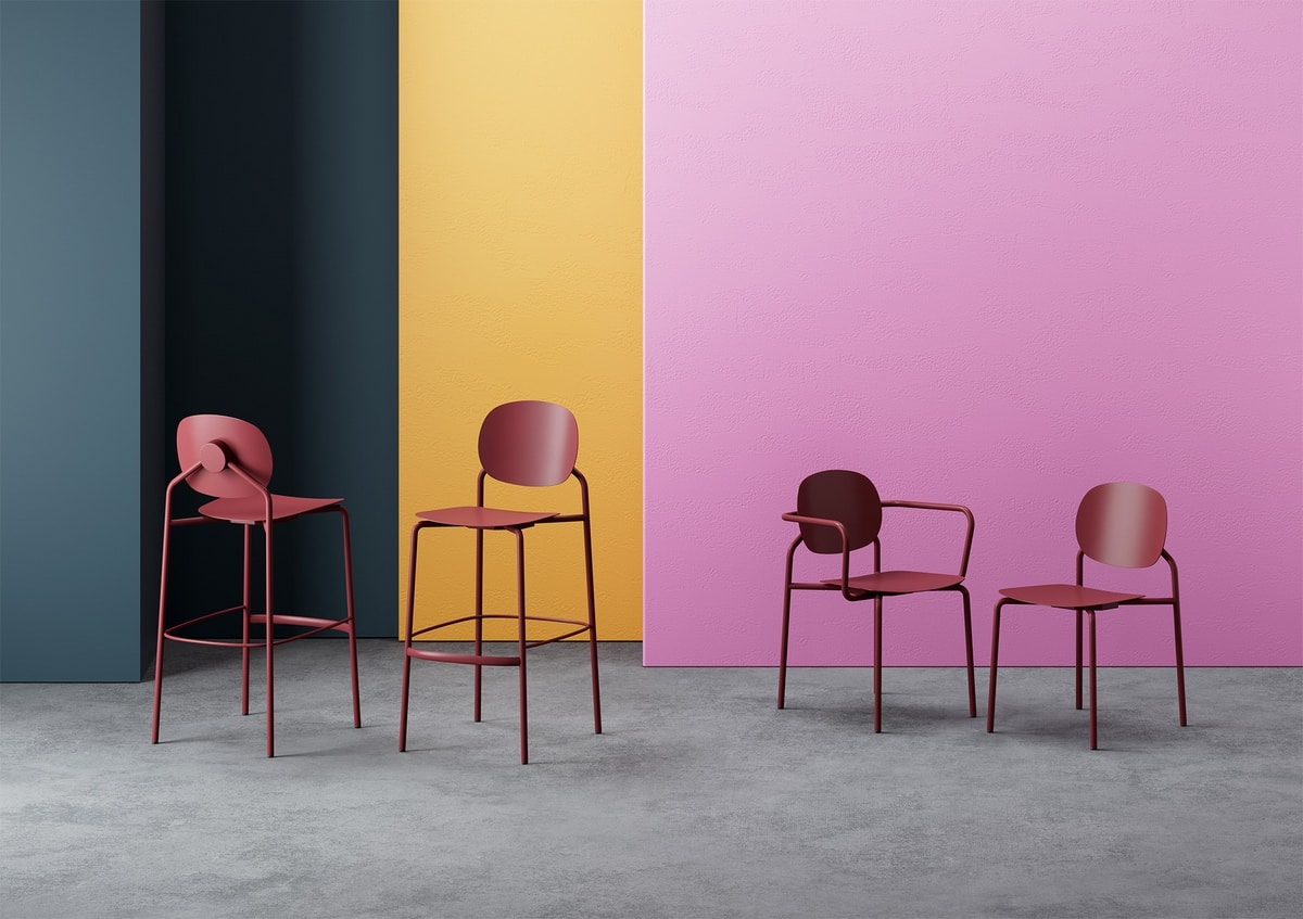 La collezione si compone di sedia, poltroncina, sgabelli in due altezze (H65 o H75) tutti rigorosamente impilabili.