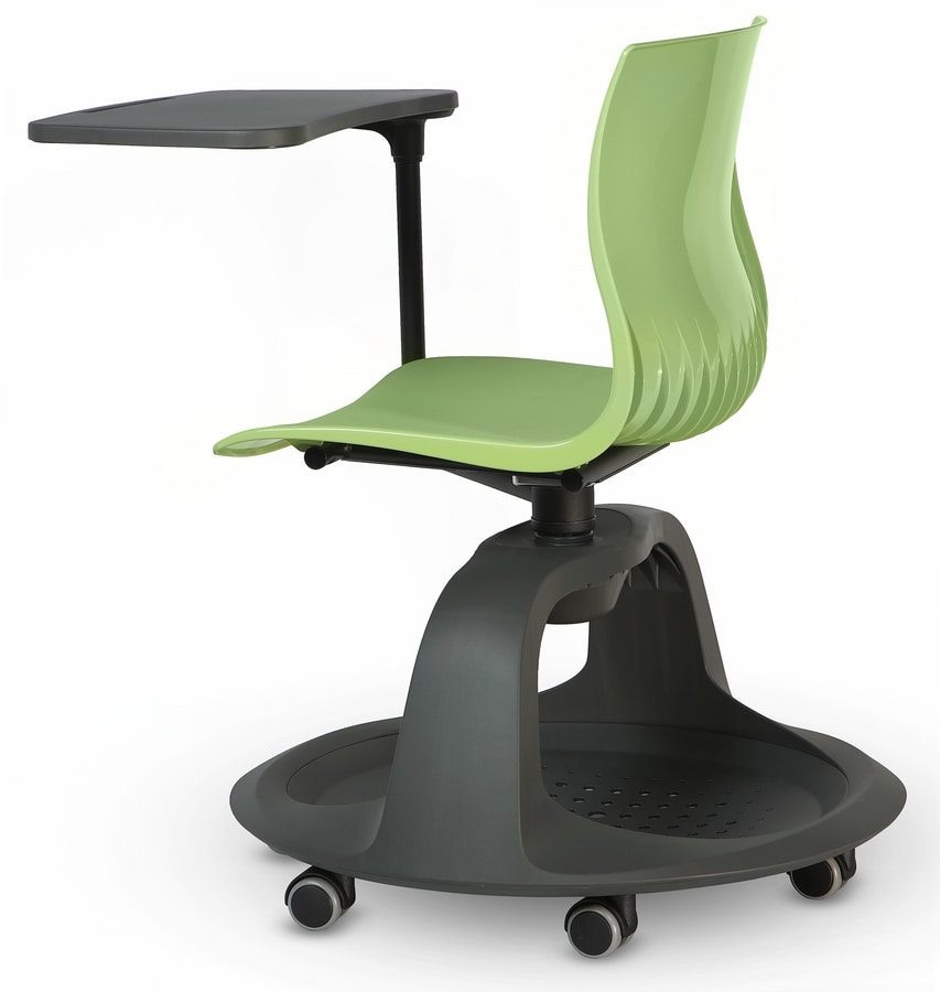 Sedute girevoli dotate di base in nylon con contenitore con 6 ruote, disponibili nei colori antracite o grigio, o girevoli su base a 5 razze in nylon con ruote o piedini e con regolazione in altezza oleopneumatica, tavoletta orbitale ambidestra in HPL nero inserita su braccio rotante metallico. Struttura metallica per sedute dinamiche Webby in nylon.