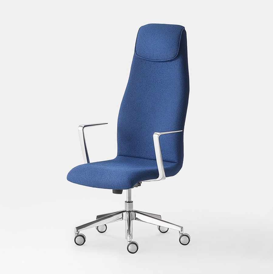 Proposta con diverse soluzioni di meccanismi e di braccioli, rivestita con tessuti materici e vibranti, accarezza lo sguardo e offre un comfort discreto, ideale per lunghe ore di lavoro creativo o decisioni strategiche.