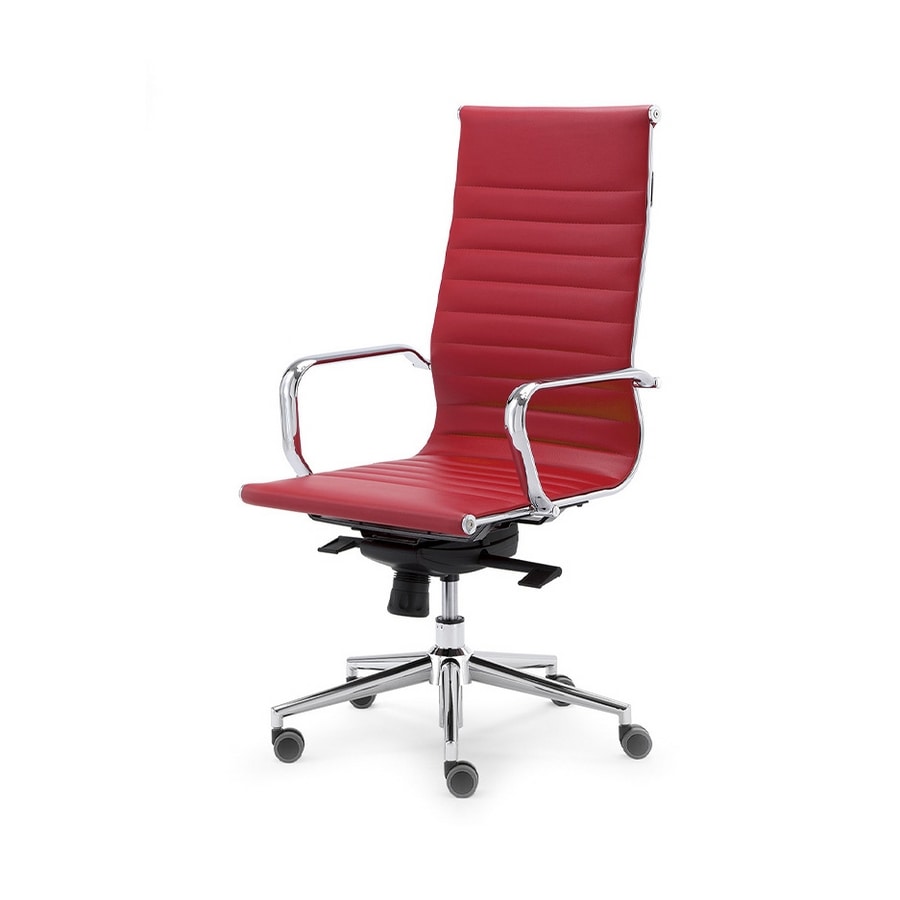 Richiedi prezzi Prodotti similiSedia Direzionale con struttura in Alluminio Lucido a 5 razze e con seduta e schienale alto imbottiti e rivestiti in Similpelle Nera, Bianca o Rossa con Braccioli fissi.