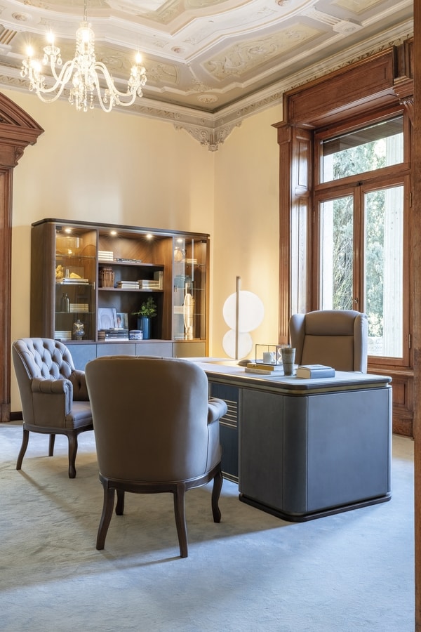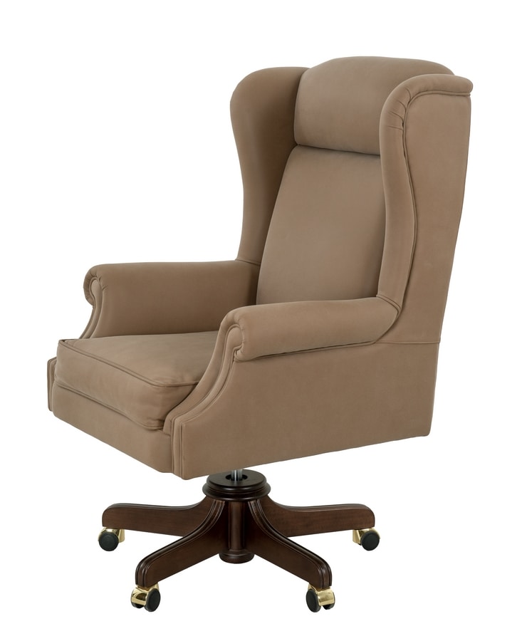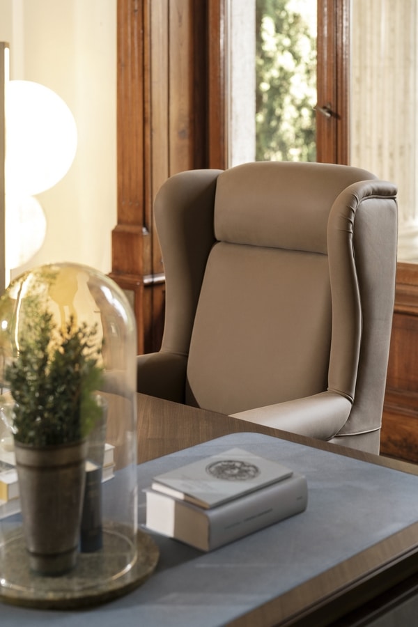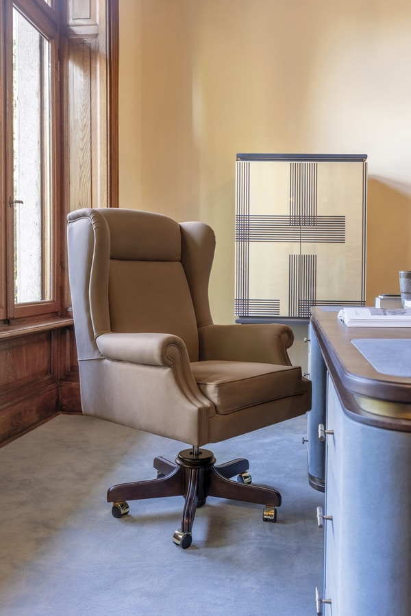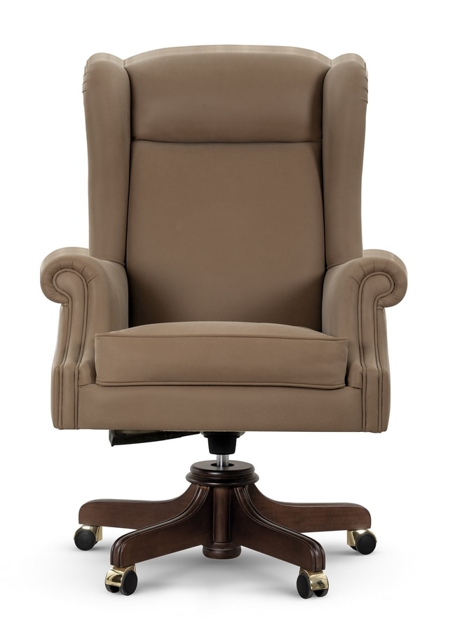 Poltrona direzionale dallo stile classico, rivestita interamente in pelle e impreziosita da eleganti braccioli sagomati. La struttura è completata da una solida base in legno tinto noce, dotata di ruote e rifinita con verniciatura opaca per un effetto sobrio e sofisticato. Una seduta pensata per unire comfort e autorevolezza in ambienti di rappresentanza.