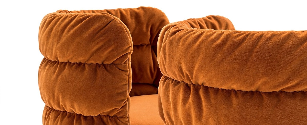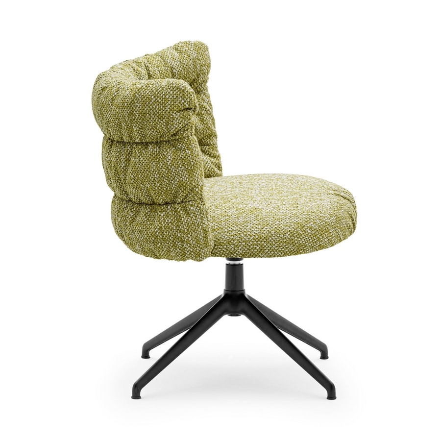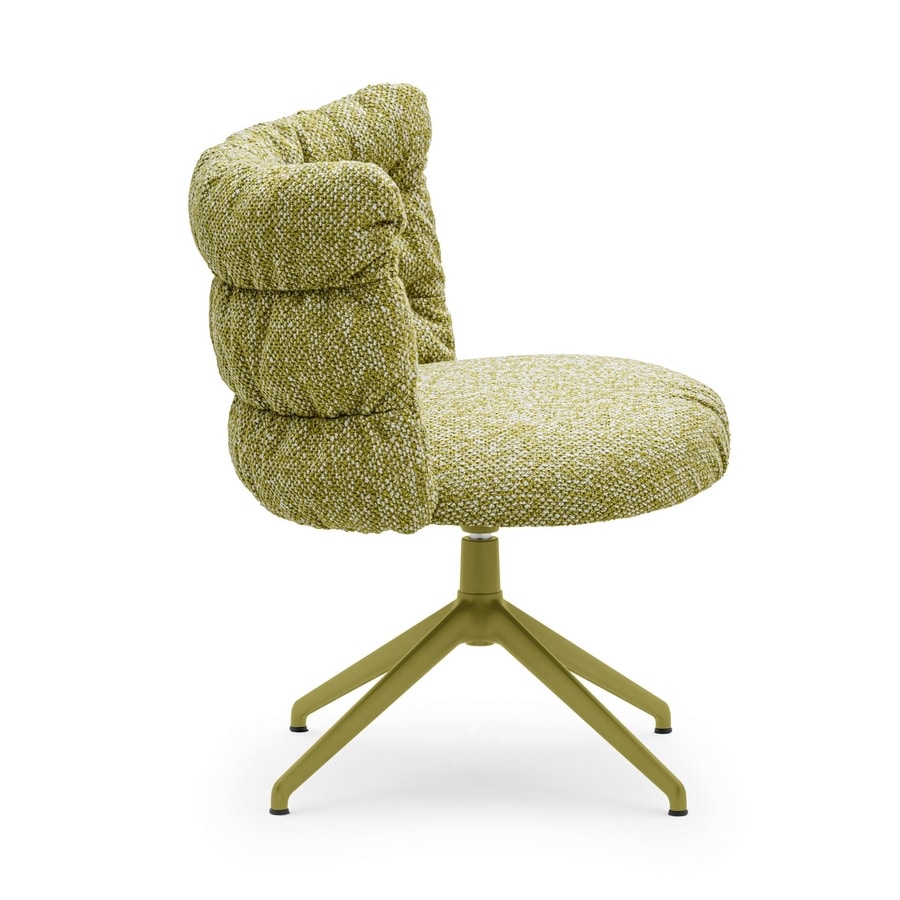 Sedia con scocca in multistrato di faggio, tappezzato su fusto con imbottitura dello schienale in piuma sintetica. Sedile tappezzato su pannello. Base 4 razze girevole in alluminio.