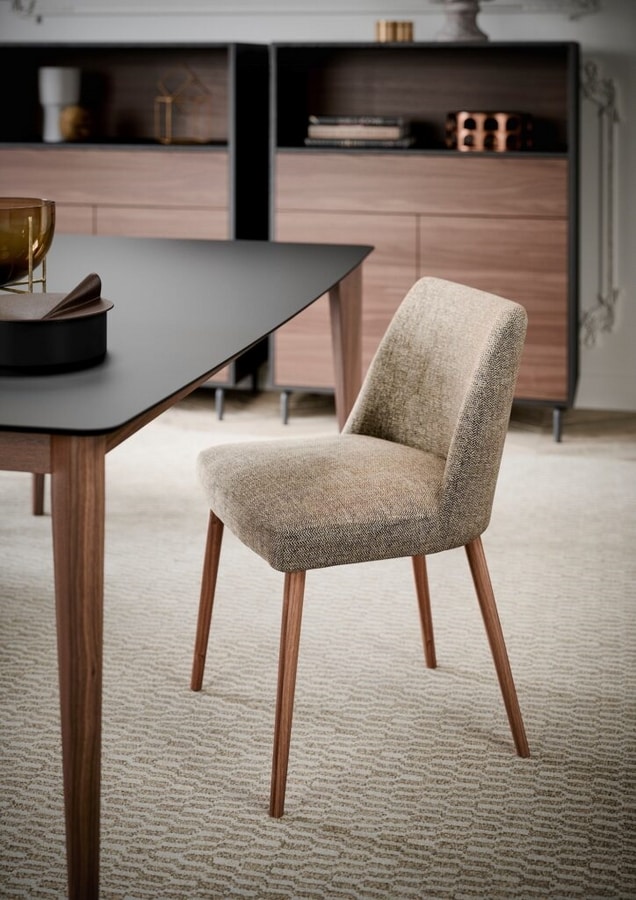 Richiedi prezzi Prodotti similiSedia con struttura in legno massello, frassino o noce, in diverse finiture e seduta imbottita (con cinghie elastiche) la rendono molto leggera. Opzioni disponibili: gamba rivestita e altezza schienale 90 cm.