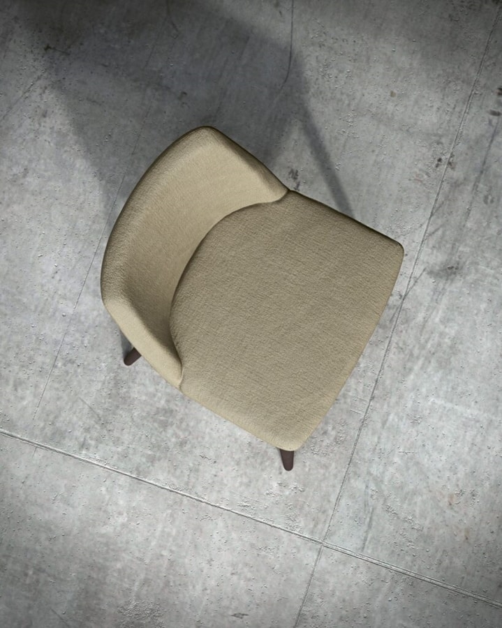 La forma particolare dello schienale sembra destinato oltre che a sorreggere, anche ad avvolgere e abbracciare.