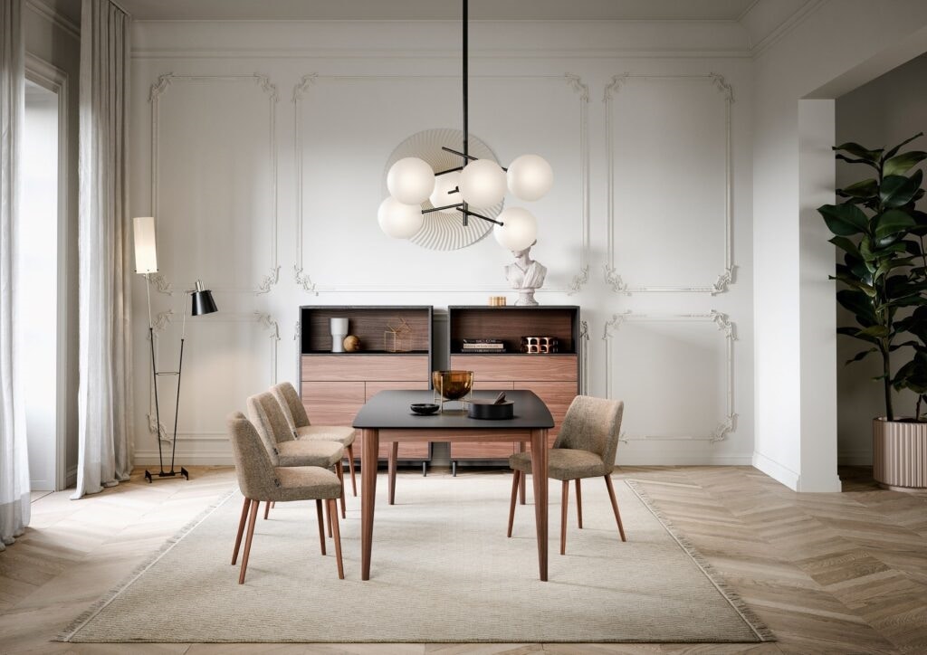 La sedia Fenice è caratterizzata da una seduta e da uno schienale imbottiti.