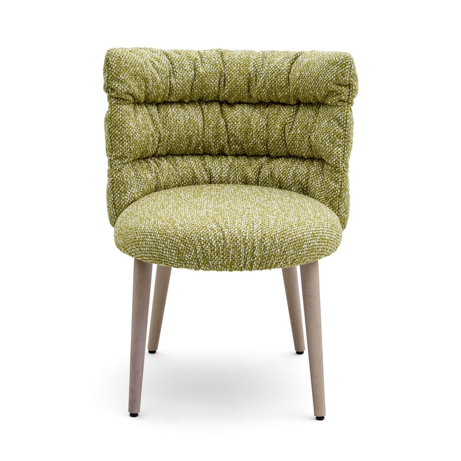 Sedia, scocca in multistrato di faggio, Gambe con profilo tondo in massello di faggio, tappezzato su fusto con imbottitura schienale in piuma sintetica. Sedile in espanso a densitā differenziata, tappezzato su pannello.