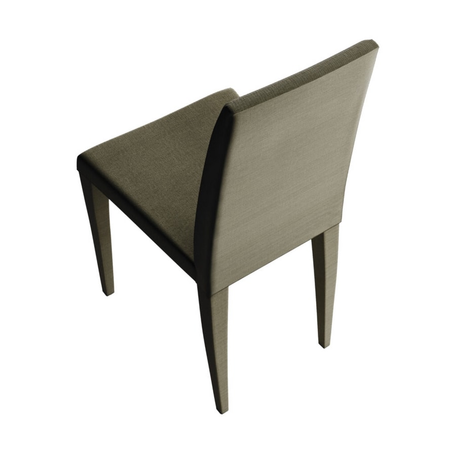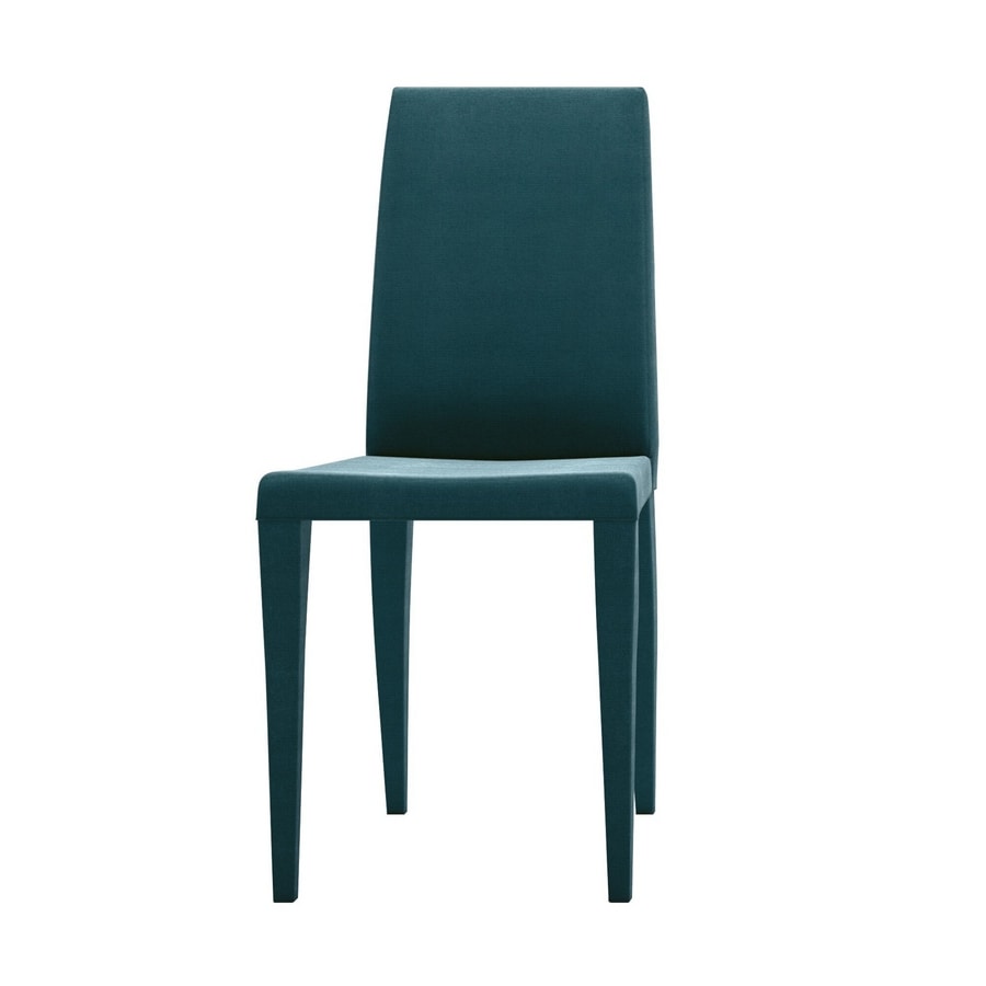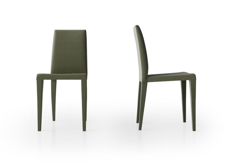 Sedia con struttura in legno massello con rivestimento personalizzabile, disponibile nella versione con gamba rivestita.