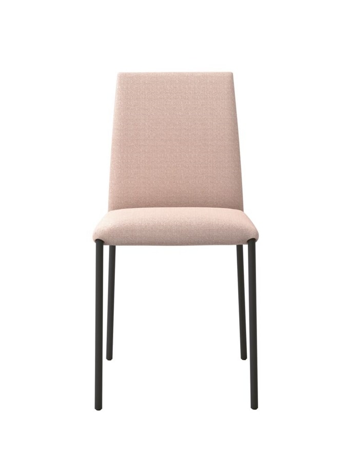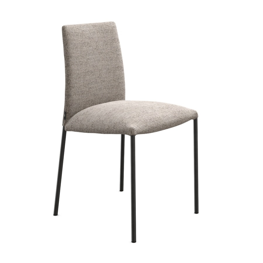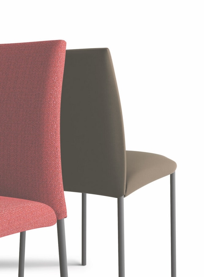 L’imbottitura e lo schienale lievemente arcuato rendono confortevole la sedia rivestita Baba.