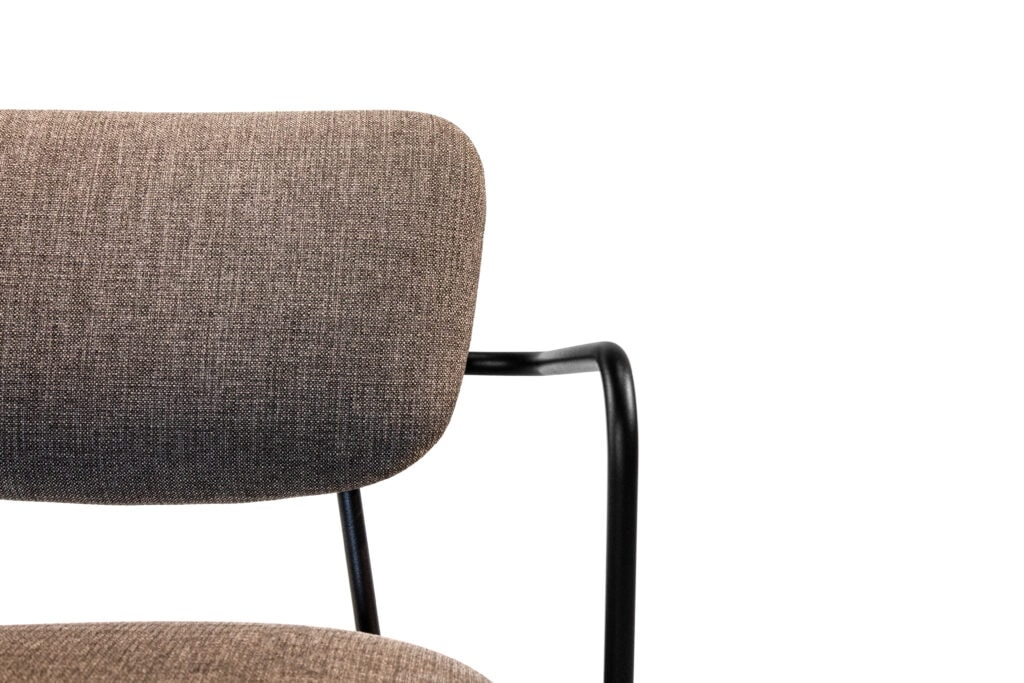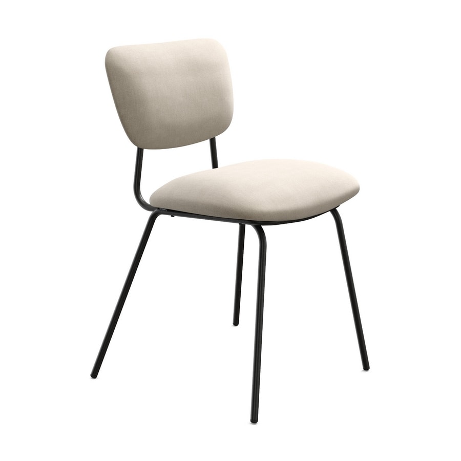 Sedia e poltrona con struttura in metallo, disponibili nei colori nero e bianco. Possibilità di personalizzare il rivestimento.