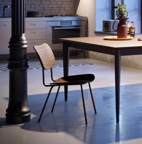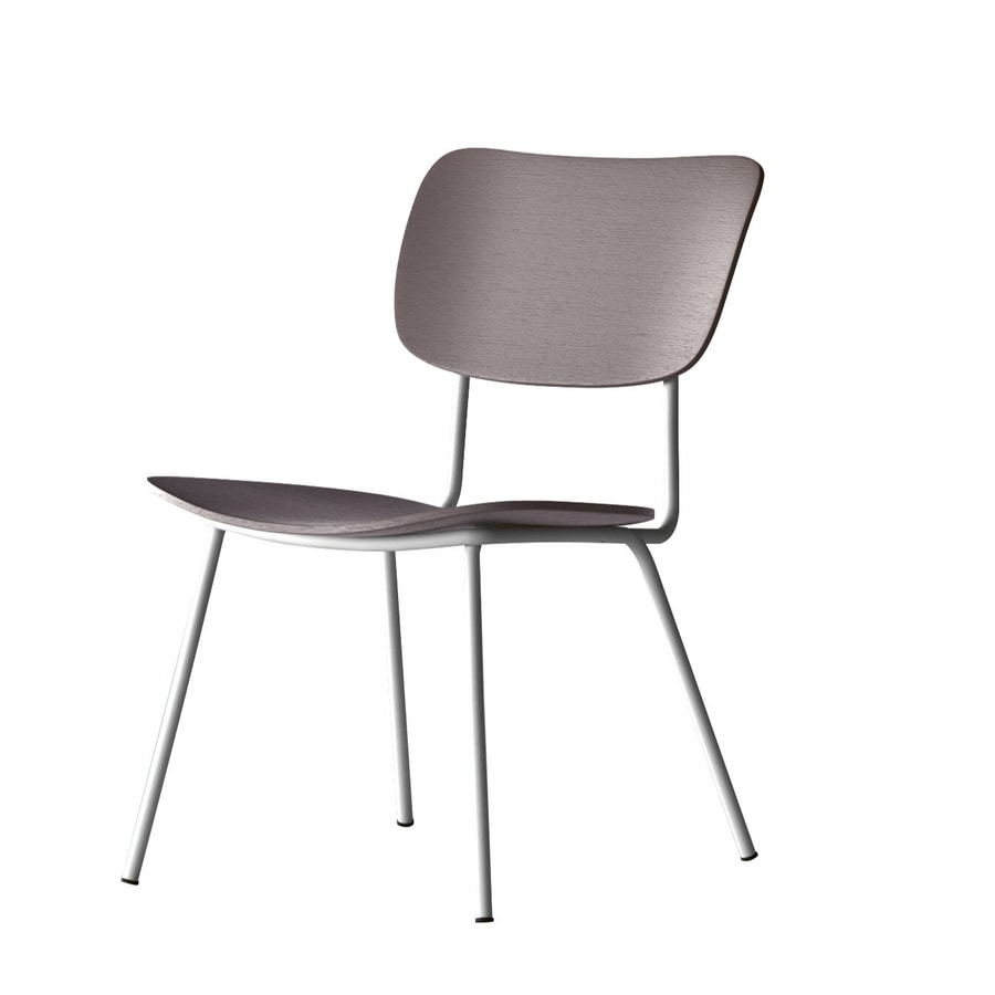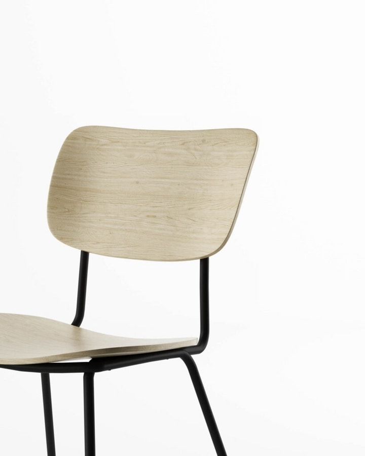 Suggestioni vintage con Retrò, sedia e poltroncina con struttura in metallo verniciato opaco e seduta e schienale in legno di noce nazionale o rovere.