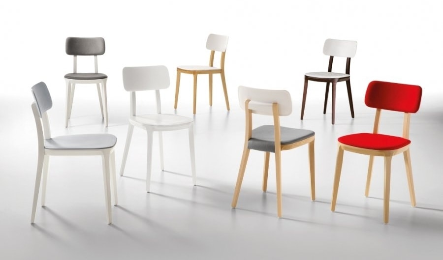 Sedia con struttura in massello di faggio tinto naturale, wenghe, laccata bianca o nera, seduta in polipropilene con colori a campionario.
