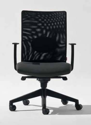 Sedia ufficio con seduta imbottita e schienale in rete. Braccioli a T. Base girevole a 5 razze con ruote.