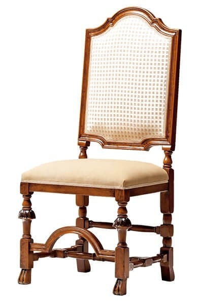 Sedia in faggio imbottita, ispirata al tardo 1800 lombardo. Schienale sagomato e modanato, gambe tornite ed intagliate raccordate sul fronte da una traversa sagomata ed unite tra loro da una crociera.