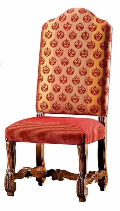 Sedia Luigi XIV in faggio, ispirata allo stile francese del 1600. Interamente imbottita con base intagliata con foglie d'acanto stilizzate.