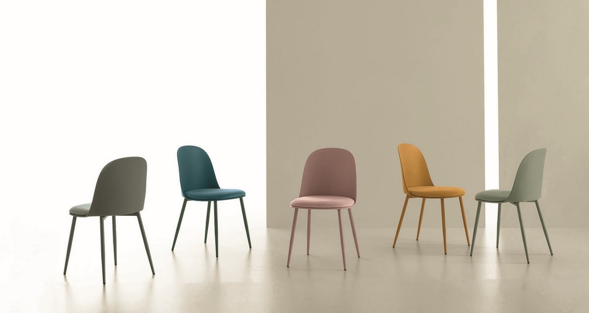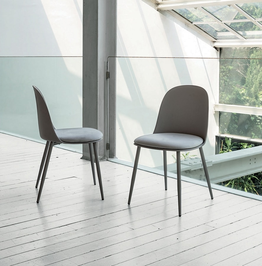 Sedia in polipropilene con cuscino imbottito e rivestito in morbida microfibra effetto velluto.