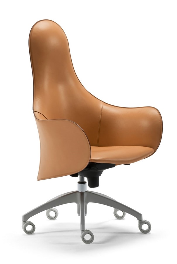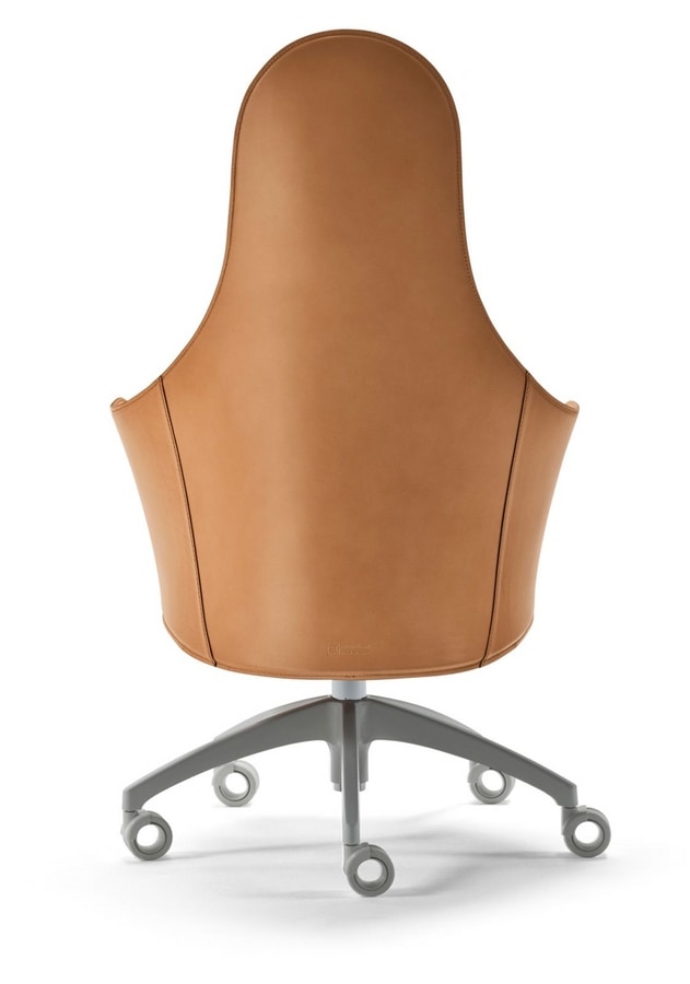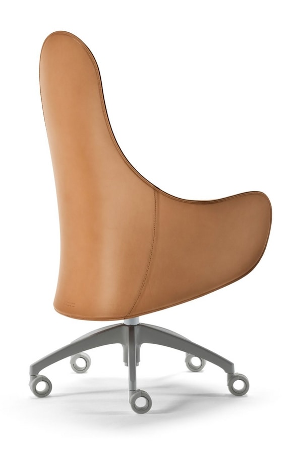 Poltrona su ruote per ufficio. Scocca in poliuretano rigido all’esterno e poliuretano flessibile stampato a freddo all’interno. Rivestimento in cuoio o pelle.