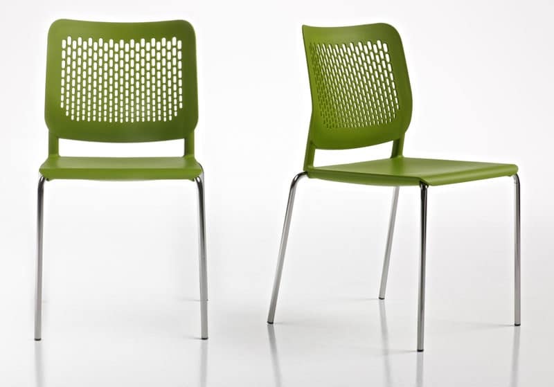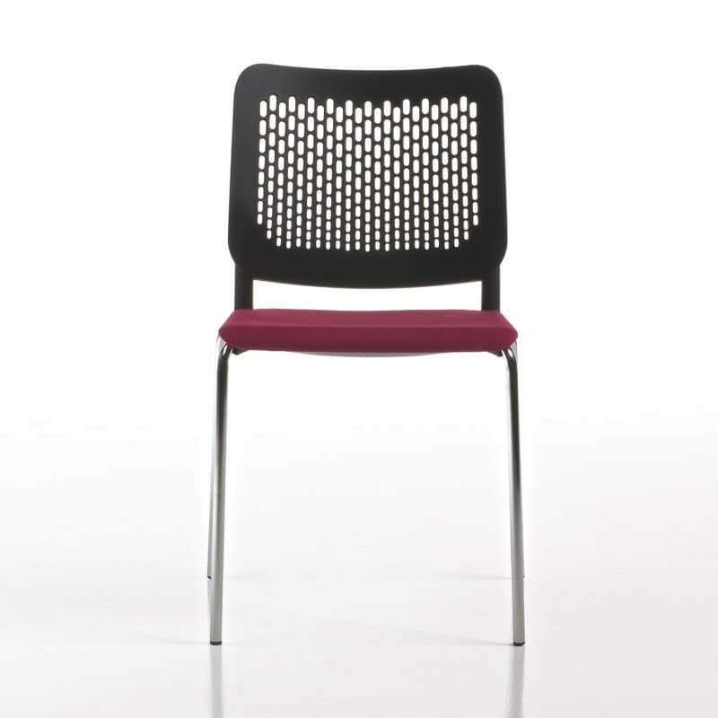 Seduta visitatore o per sale conferenza, in polipropilene colorato. Telaio 4 gambe cromato. Optional: sedile imbottito e rivestito, braccioli fissi e tavoletta scrittoio. Impilabile.