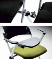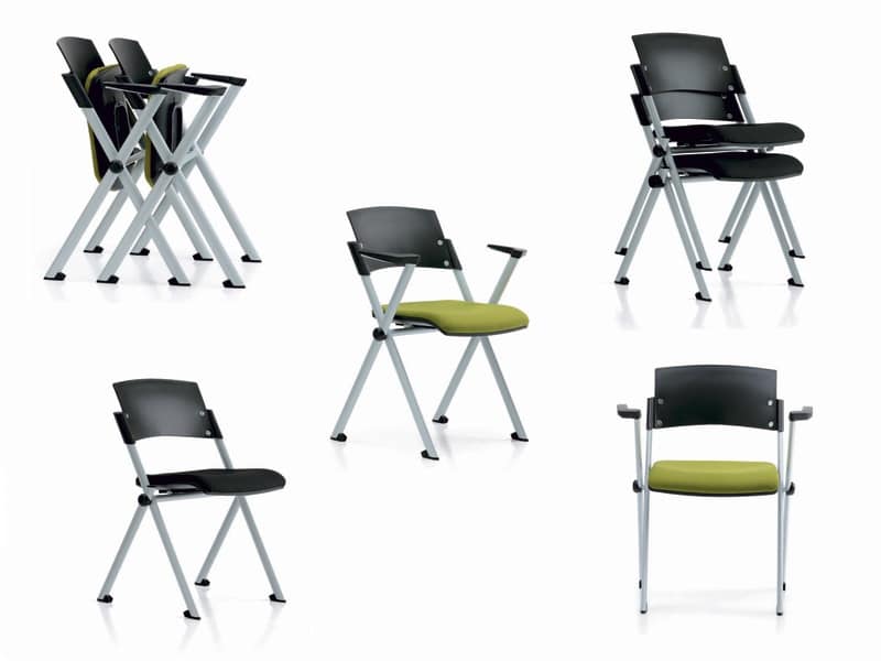 Sedia ideale per sale conferenze e collettività. Seduta imbottita e rivestita e schienale in plastica. Telaio 4 gambe in acciaio verniciato grigio. Optional: braccioli, tavoletta antipanico, numero segnaposto e fila. Sedile ribaltabile. Impilabile.