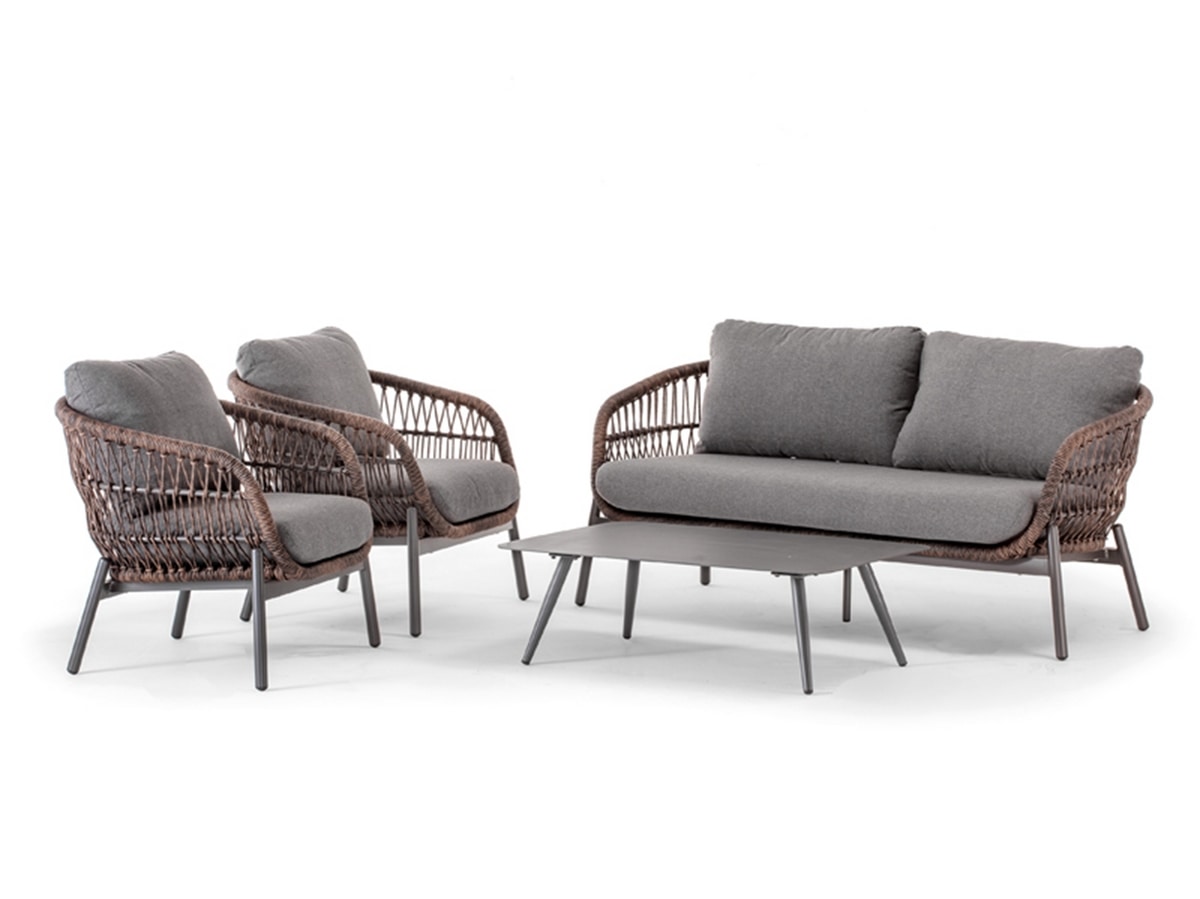 Richiedi prezzi Prodotti similiSet coordinato composto da un divano a 2 posti, due poltrone e 1 tavolino con piano in lamiera di alluminio. La struttura è in alluminio e il rivestimento è realizzato con corda sintetica Wintech. La cuscineria è sfoderabile e realizzata in tessuto Olefin.