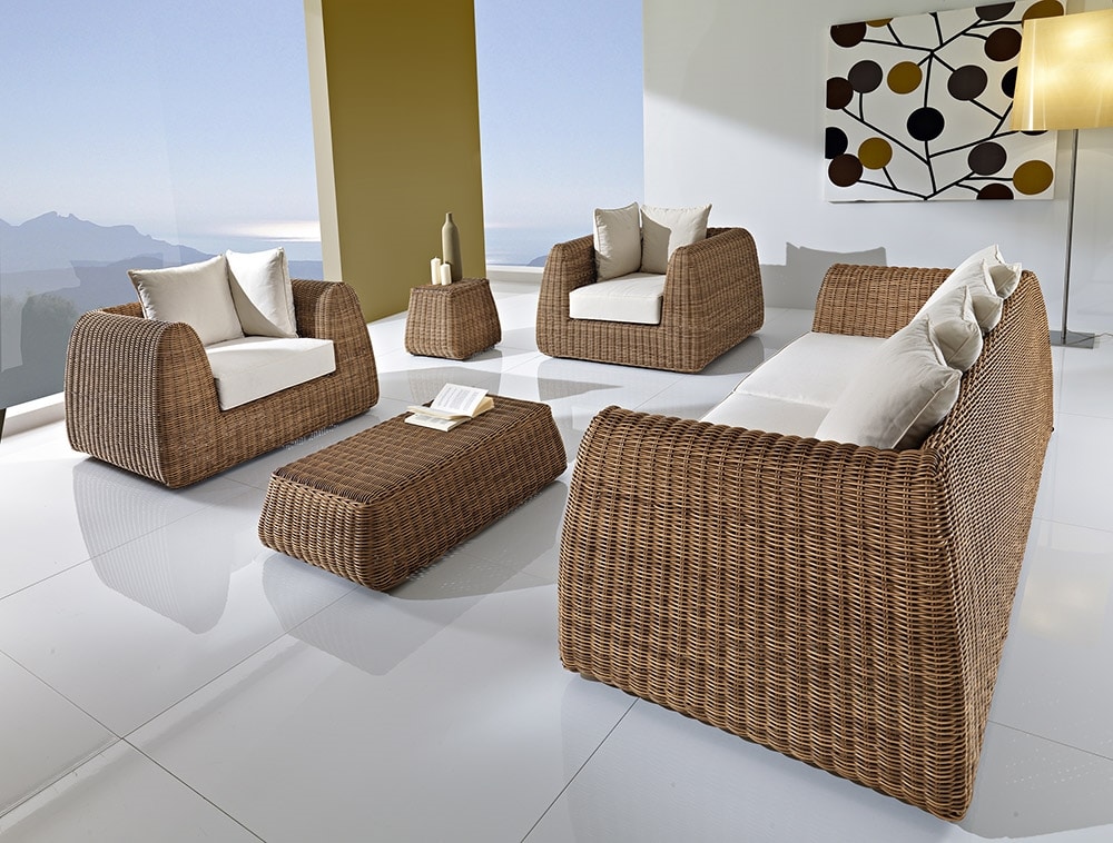 Set divano e poltrone da esterno, con intreccio in polyrattan