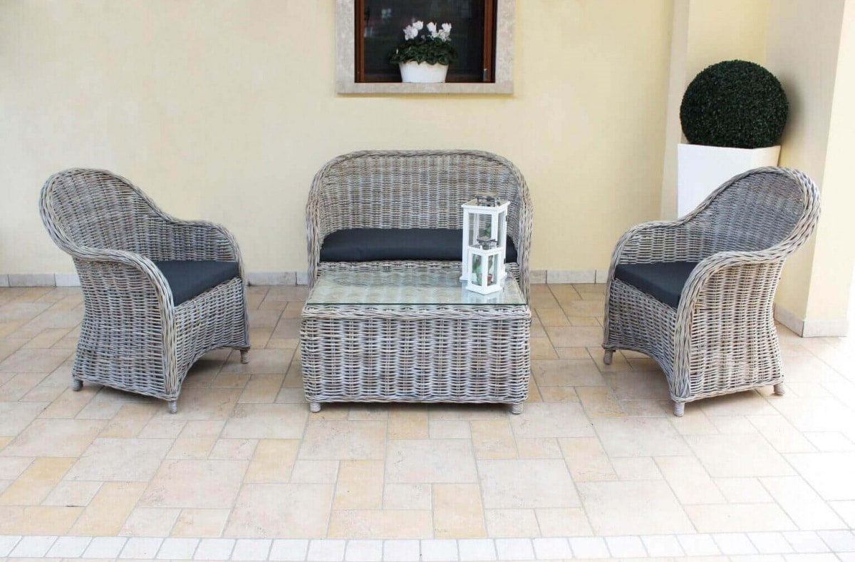 Set dal design classico, ottimo elemento per i vostri salotti, interni ed esterni. Struttura in legno, intreccio in kubu. Finitura naturale.