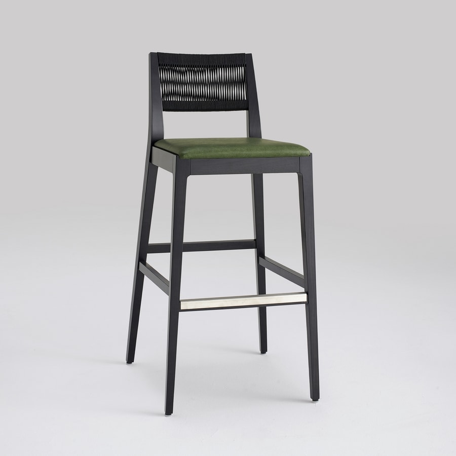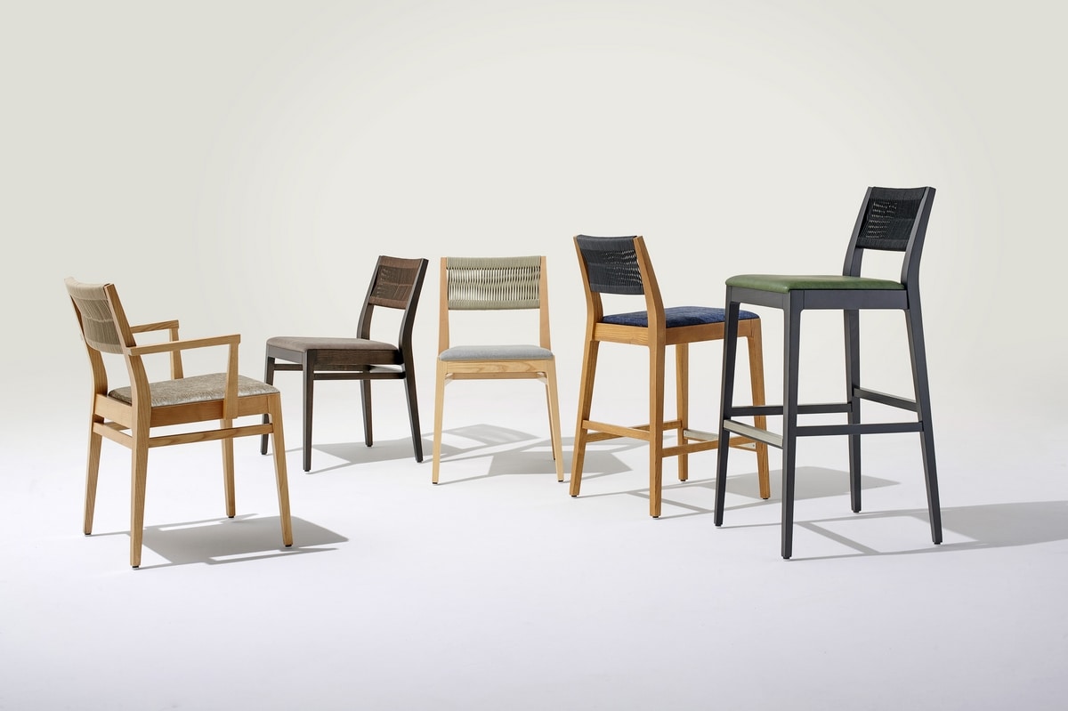Sgabello. La nuova collezione MARINA unisce comfort, design e maestria artigianale in un equilibrio perfetto tra innovazione e tradizione. Lo schienale intrecciato a mano in corda nautica e la struttura in legno di frassino definiscono uno stile autentico, ideale per ogni spazio, contract o residenziale.