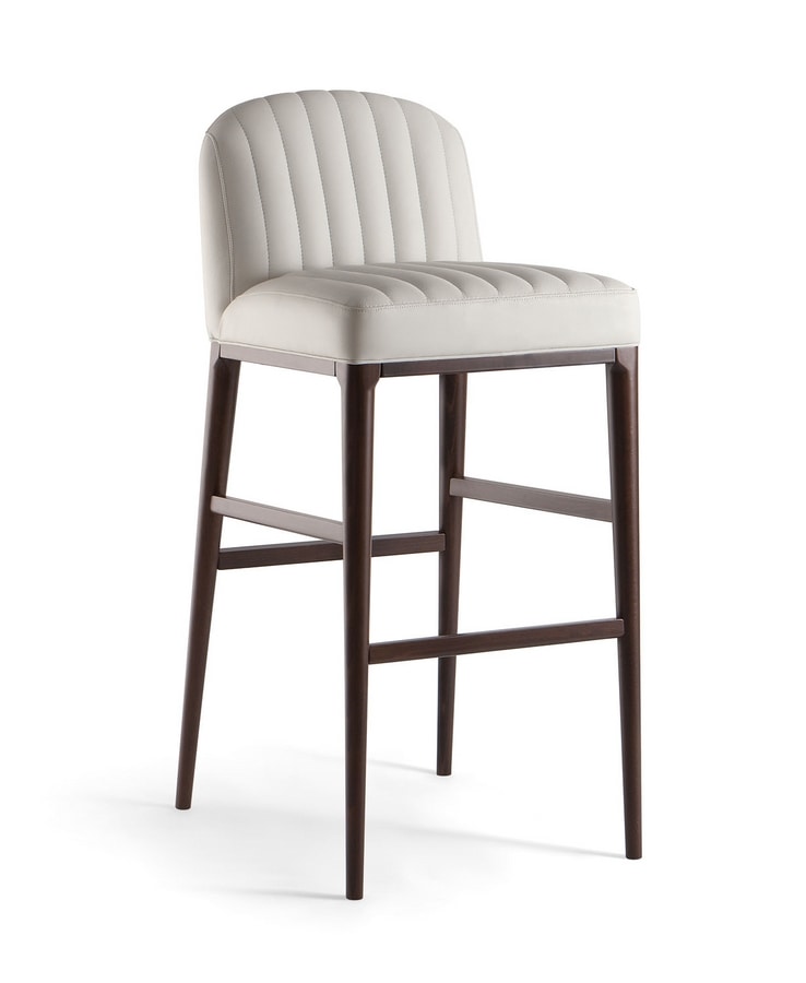 Elegante e raffinata struttura in legno massello, rivestita da una morbida imbottitura che regala comfort e relax ad ogni seduta. L'imbottitura con cuciture a vista è l'elemento caratterizzante di questo progetto, tutto dedicato ad ambienti di relax. Il bordo il legno massello, che percorre l'intera struttura, dona eleganza e raffinatezza a questo sgabello. La vasta gamma di tessuti disponibili e le diverse tinte del legno rendono il prodotto adatto ad ogni ambiente.