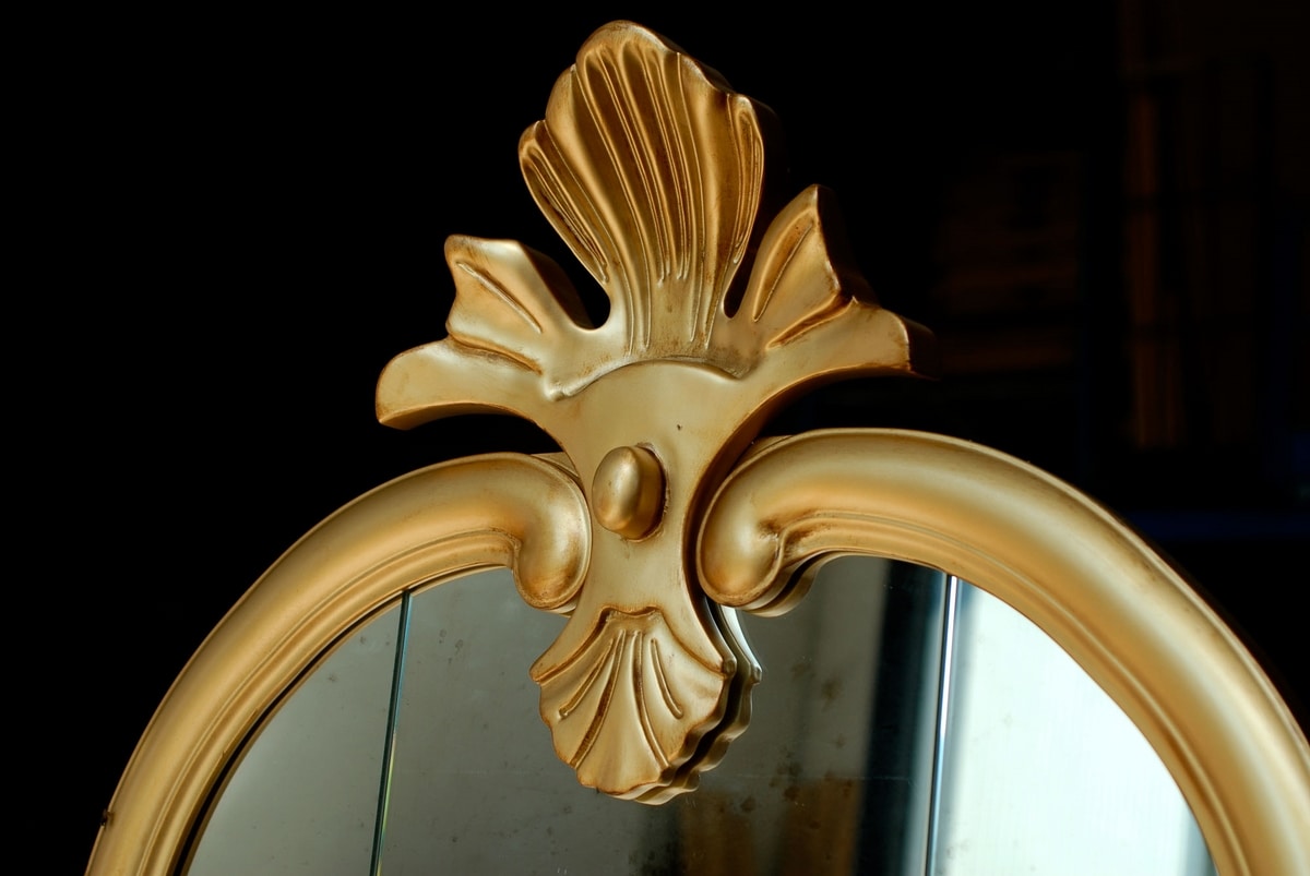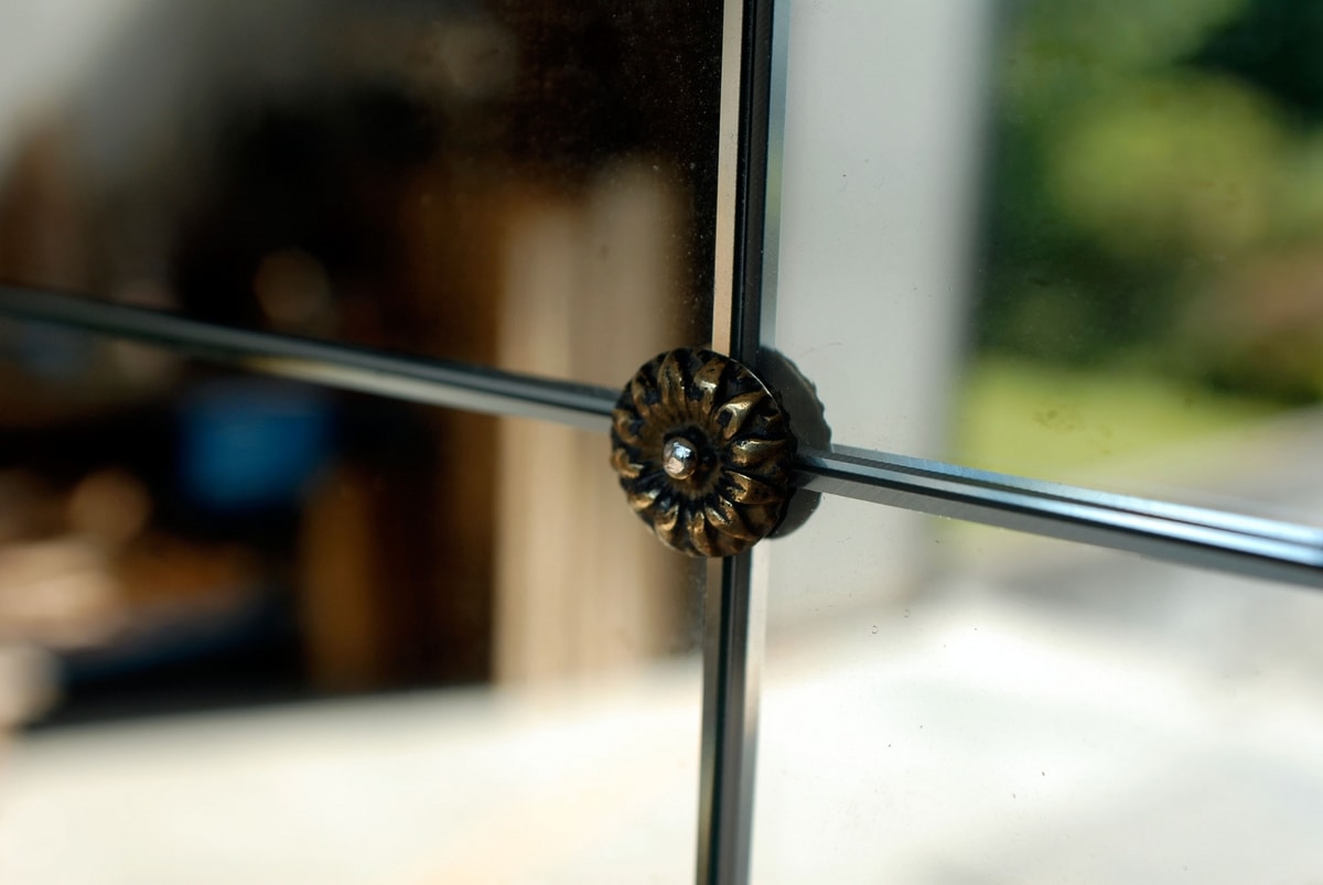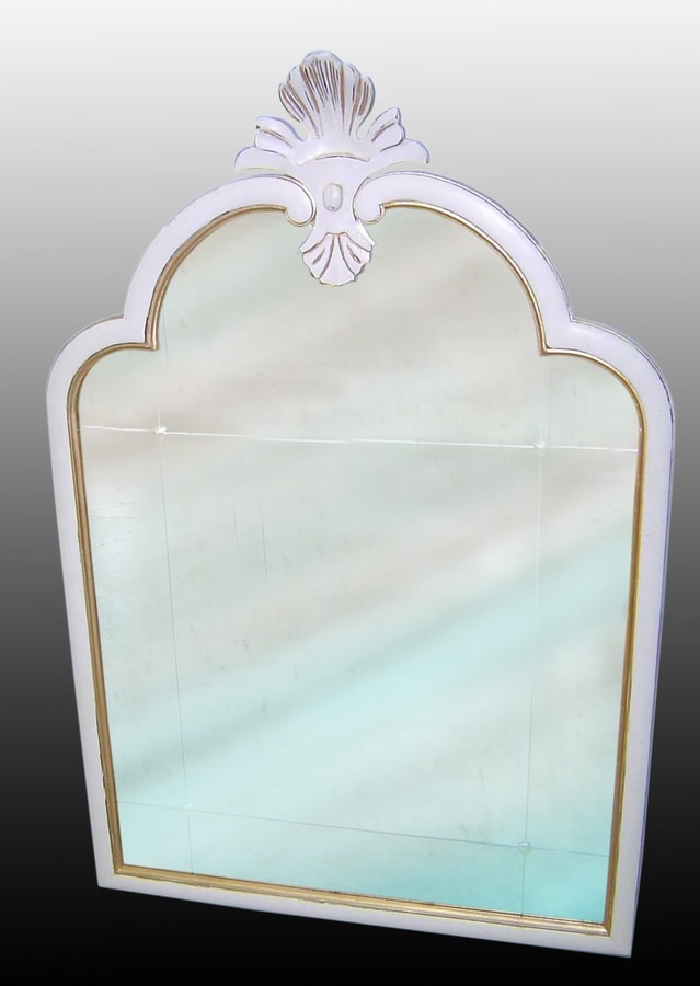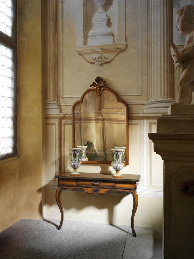 Specchiera in noce ispirata allo stile veneto fine 1700. La struttura a forma trilobata richiama il gusto dell’entroterra Veneto e culmina con un fastigio intagliato, racchiuso all'interno uno specchio anticato suddiviso in lastre fissate da borchie in ottone.