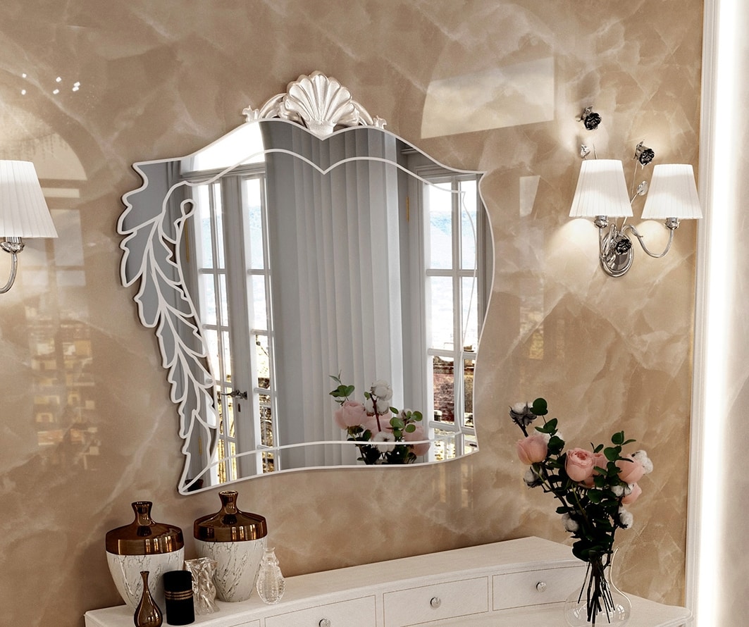 Specchiera cristallo, con intaglio decorativo in legno laccato.
