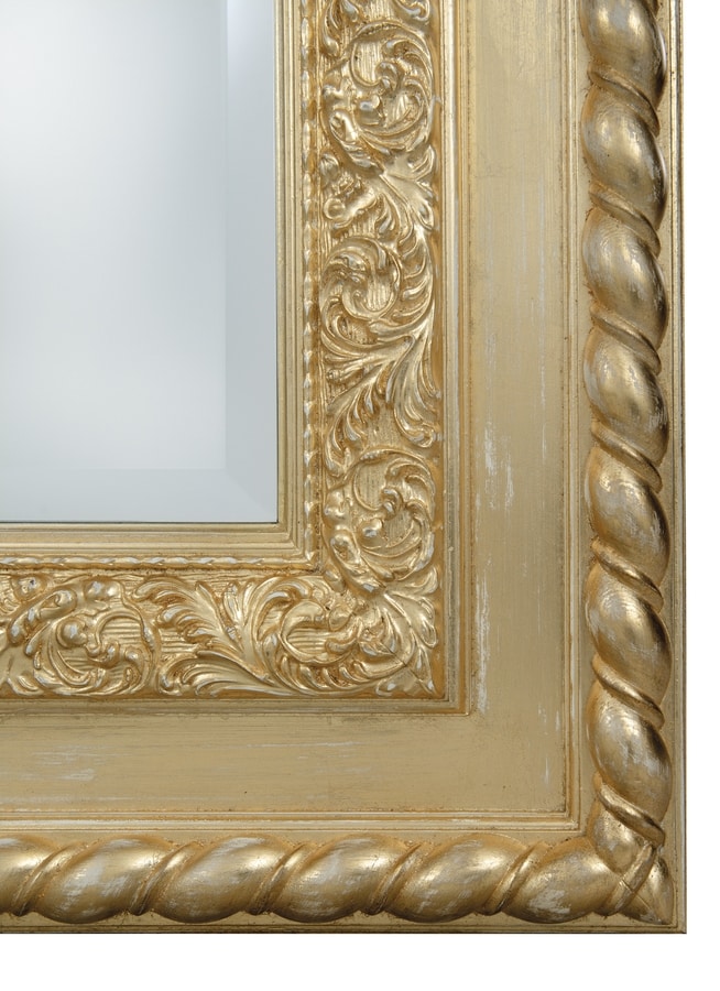 Specchiera con cornice intagliata in legno, impreziosita da motivi decorativi scolpiti a mano e proposta nella finitura OR5, oro foglia. Un elemento scenografico capace di donare luce e profondità all’ambiente, valorizzando ogni spazio con eleganza classica.