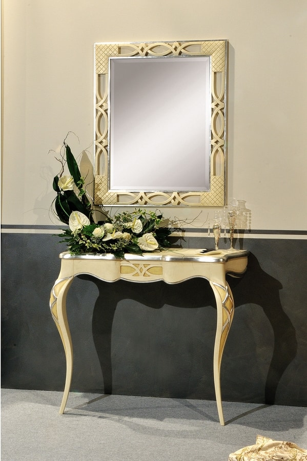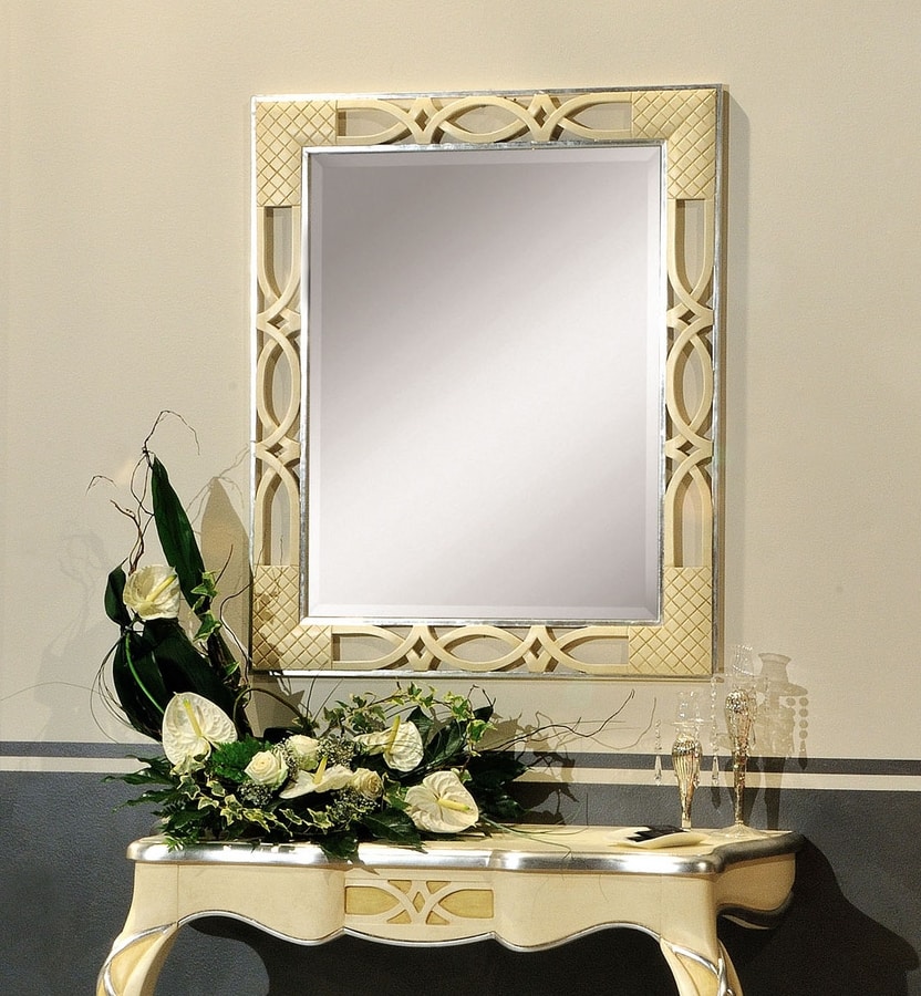 Specchiera rettangolare, con cornice in legno, con intagli decorativi. Finitura oro ed argento.